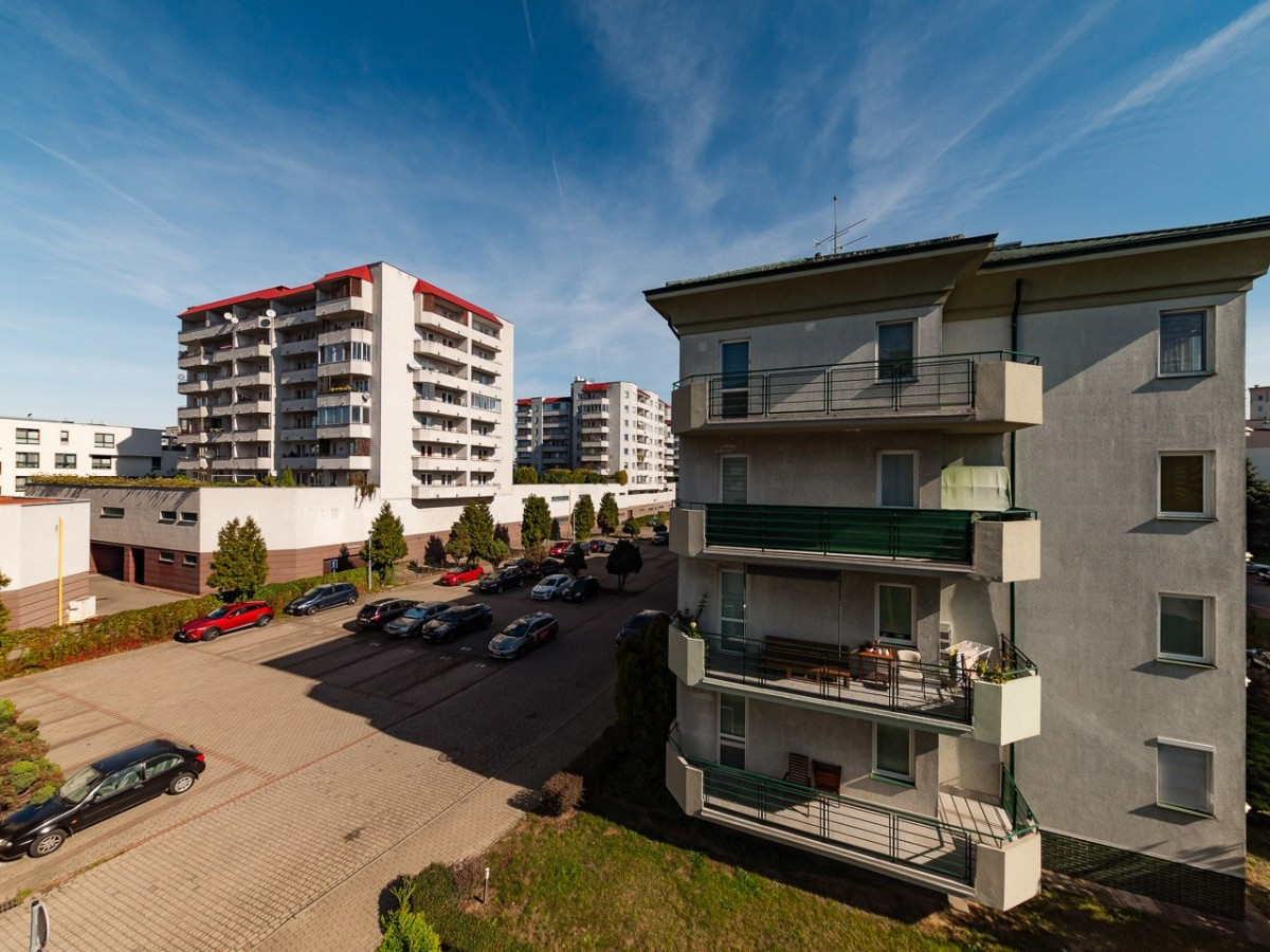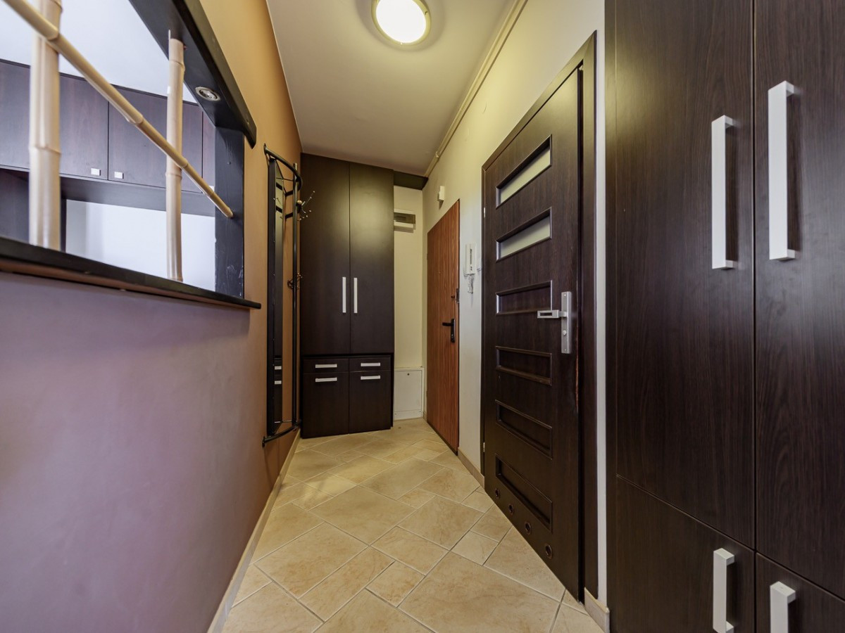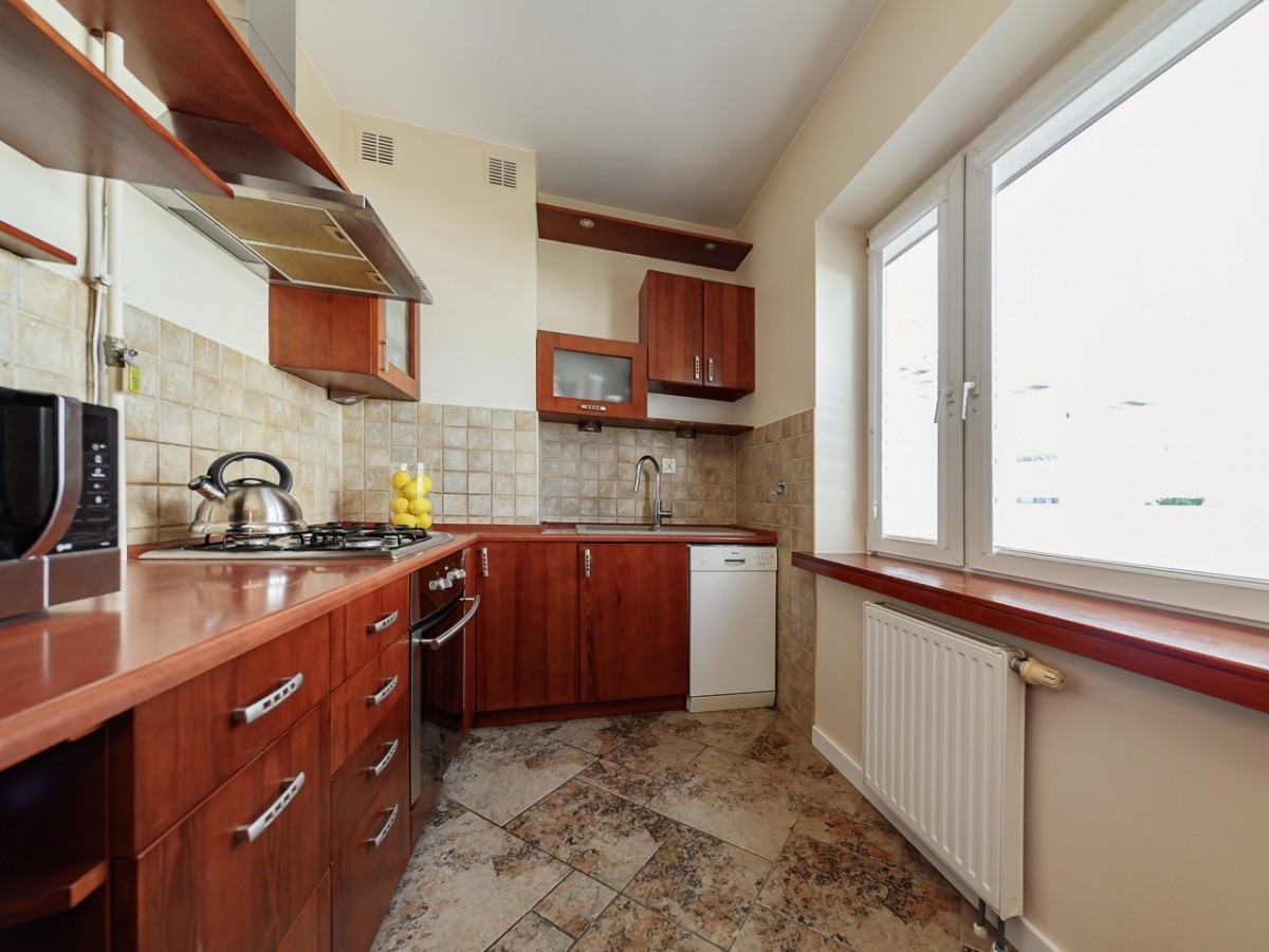 Centralną częścią mieszkania jest salon z wyjściem na spory balkon, kuchnia jest otwarta i widna, w łazience znajduje się wanna z parawanem prysznicowym a w przedpokoju spora szafa.