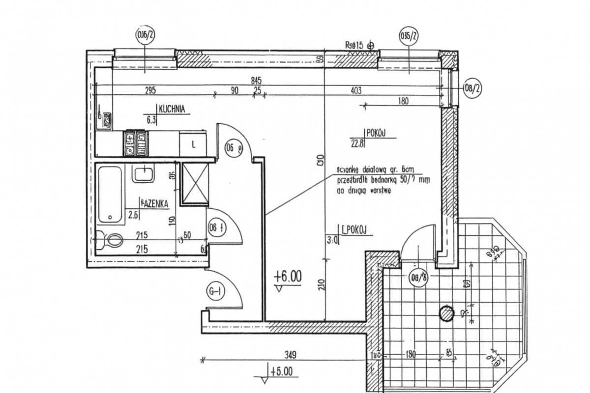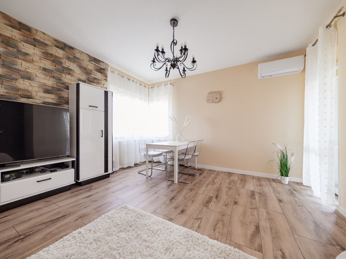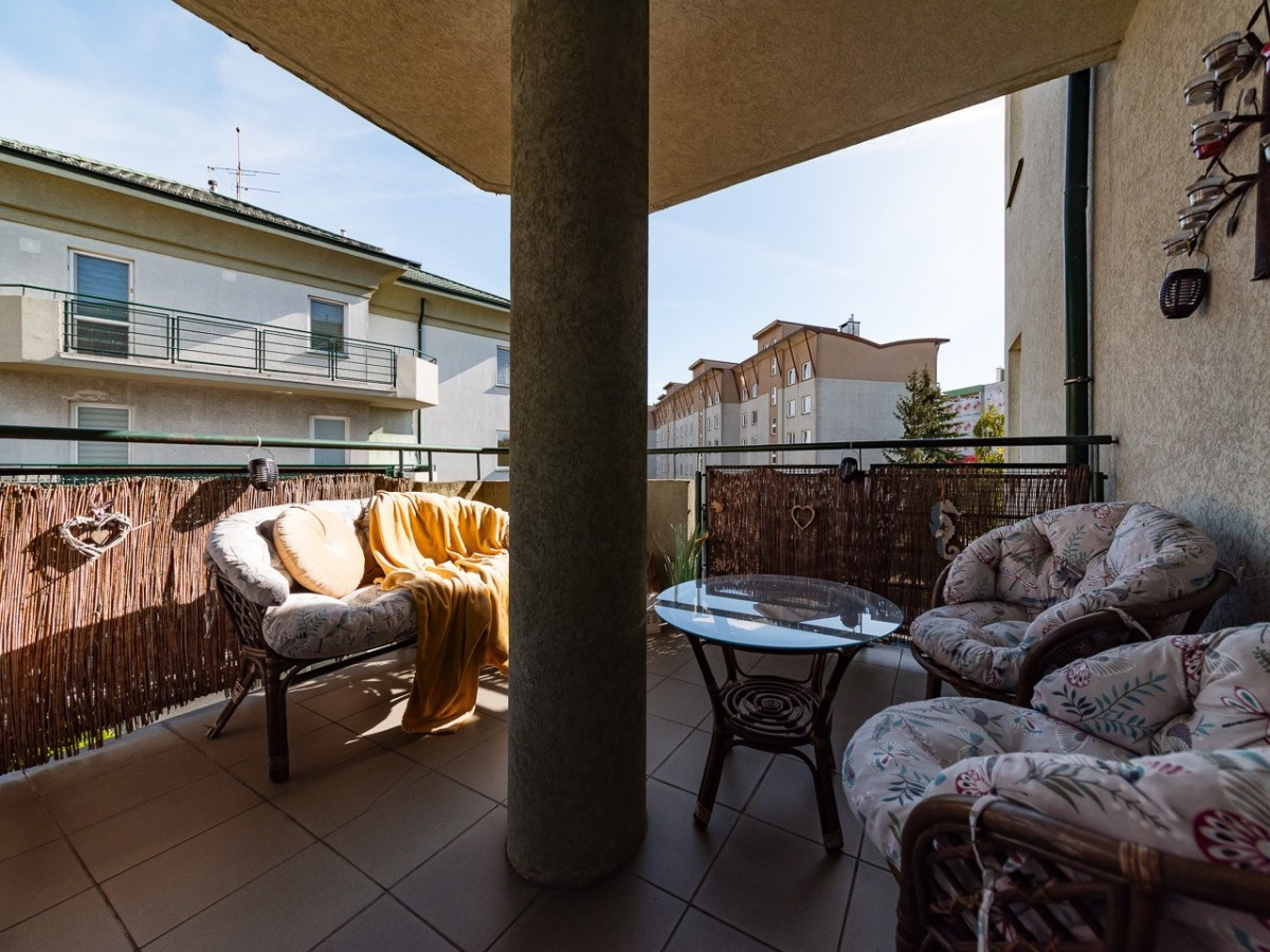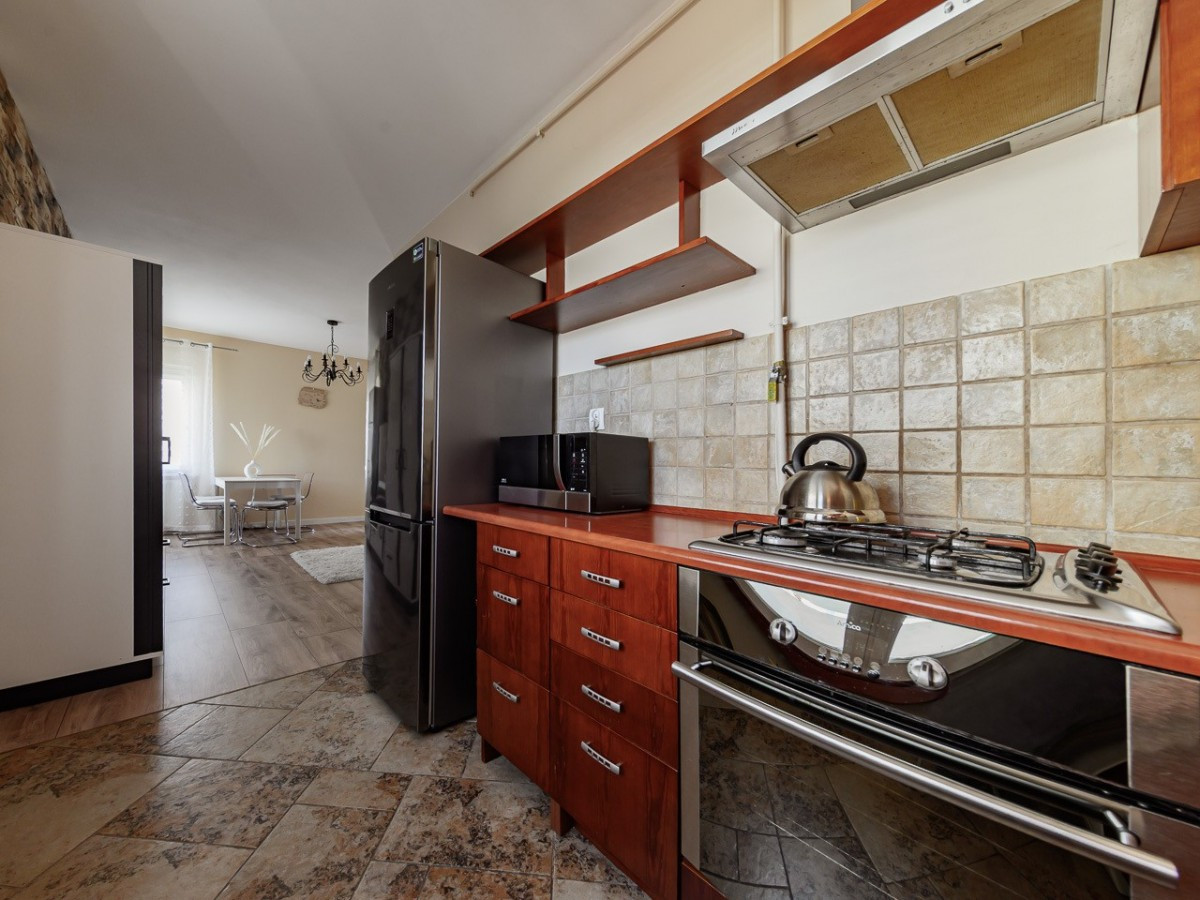 Centralną częścią mieszkania jest salon z wyjściem na spory balkon, kuchnia jest otwarta i widna, w łazience znajduje się wanna z parawanem prysznicowym a w przedpokoju spora szafa.
