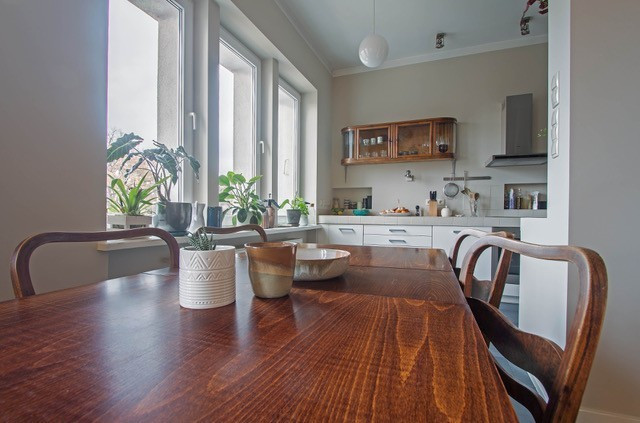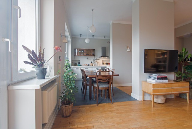 Salon (28,5 m) z wyjściem na balkon, połączony częściowo z jadalnią i częściowo z kuchnią. Cała powierzchnia dzienna ma około 40 m i piękny widok na korony drzew (Park Dreszera)