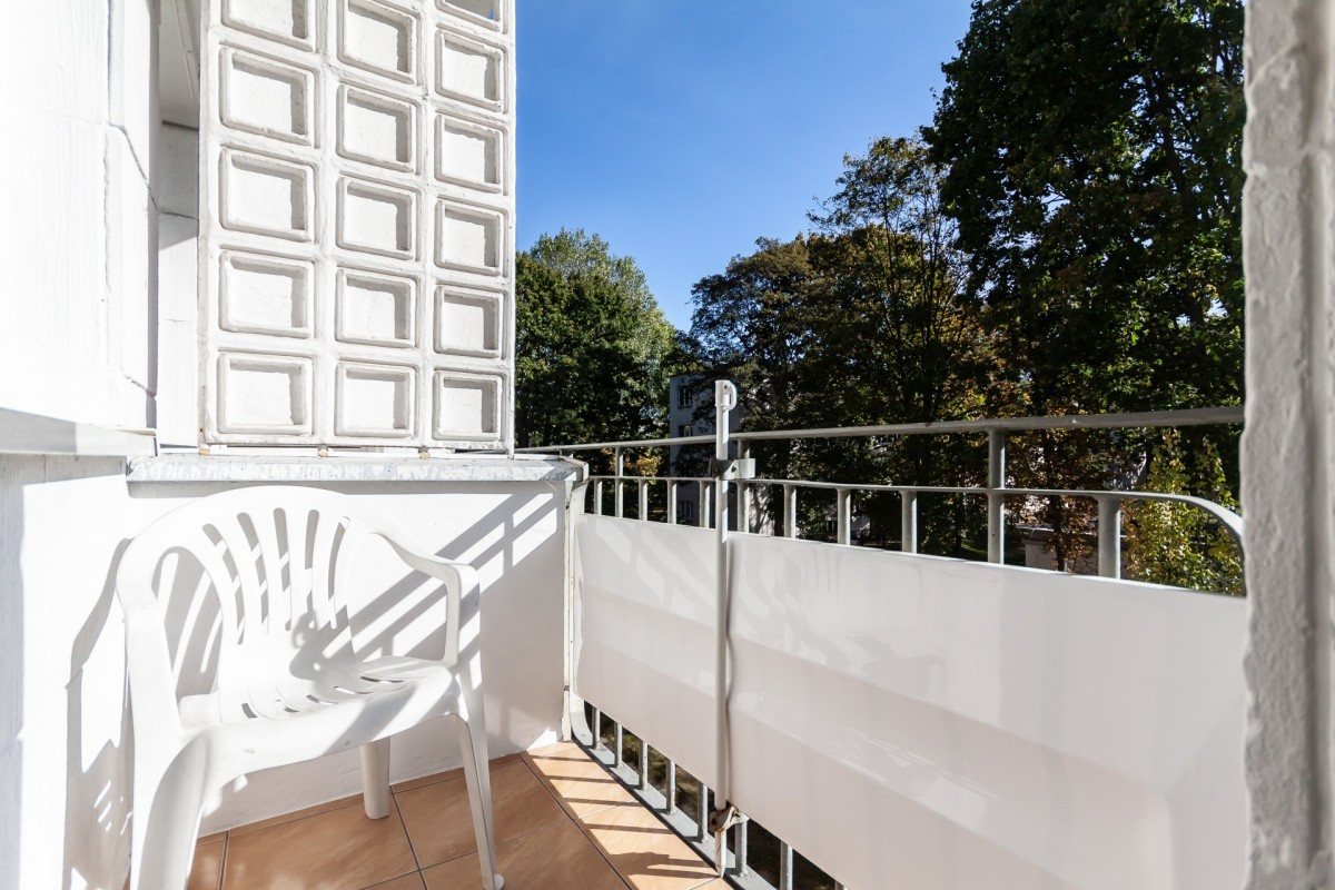 jeden z pokoi posiada balkon z widokiem na zielony plac między budynkami,