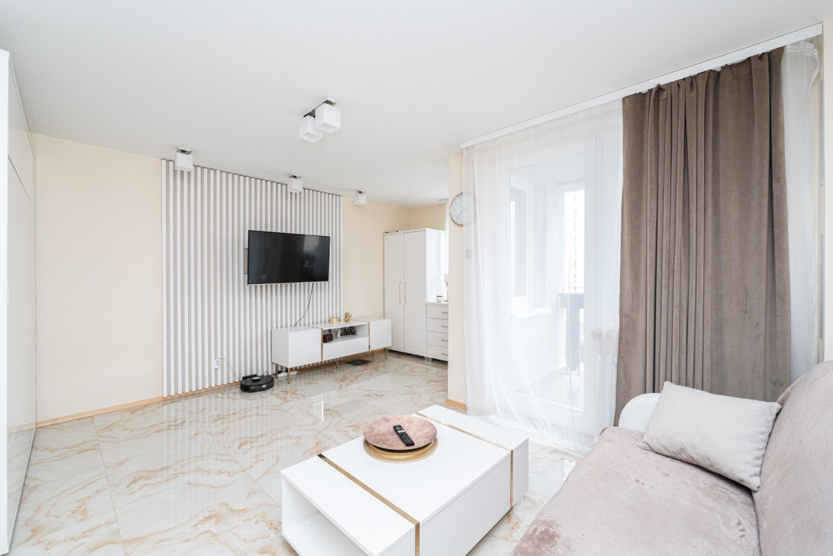 Mieszkanie narożne, jasne, z ekspozycją południowo-zachodnią z oknami wychodzącymi na ciche patio. 5 lat temu położono płytki w salonie i przedpokoju oraz panele w sypialni, a także wymieniono fronty w kuchni. W mieszkaniu w cenie mogą pozostać również dwuletnie meble, m.in. składane łóżko i kanapa w salonie, łóżko w sypialni oraz meble w przedpokoju.
