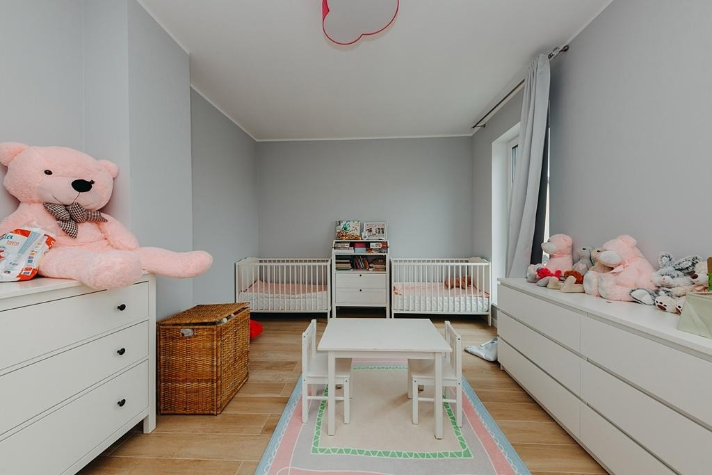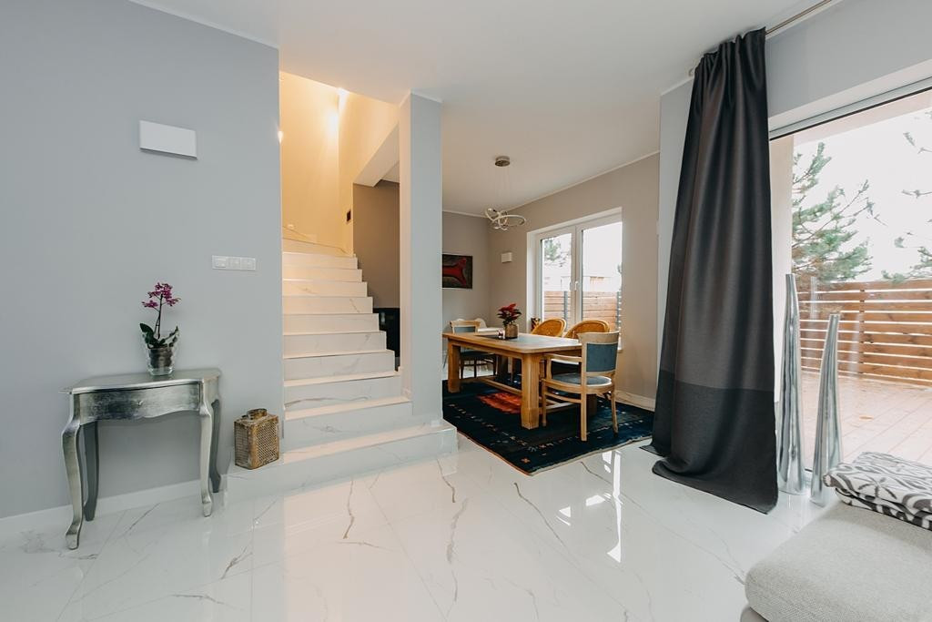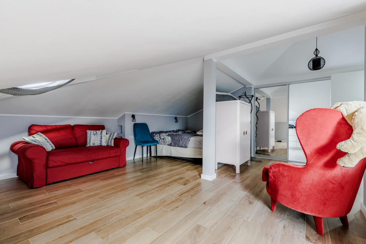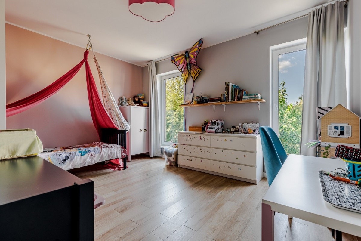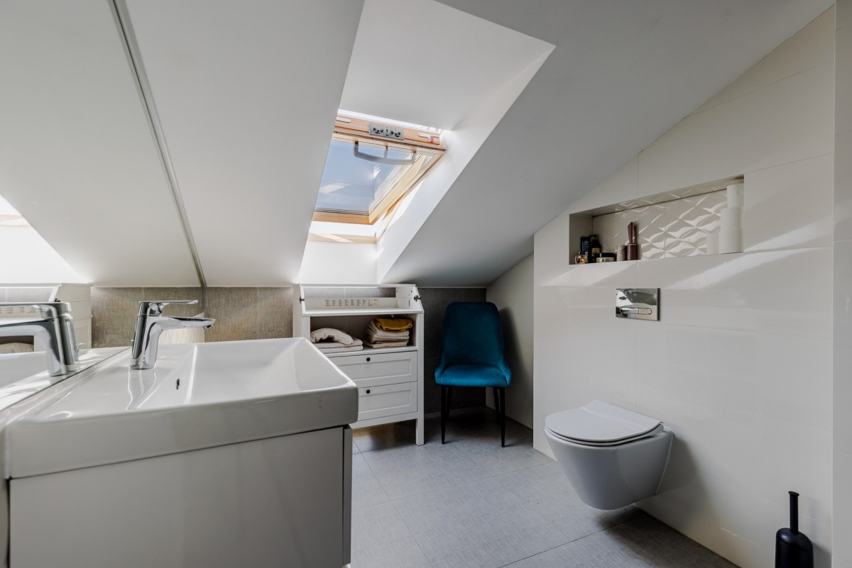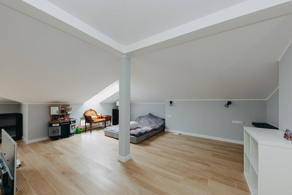 Dom wykończony jest z dbałością o detale. Doskonały rozkład pomieszczeń, przestronność jak i obfitość w naturalne światło to kolejne walory nieruchomości. W skład nieruchomości wchodzi otwarta kuchnia na salon z którego można wyjść na taras, łazienka wyposażona w wannę, druga łazienka wyposażona w prysznic, toaleta dla gości, sypialnia typu master, dwie sypialnie dziecięce, oraz sypialnia gościnna na poddaszu. Do nieruchomości przynależy również garaż.