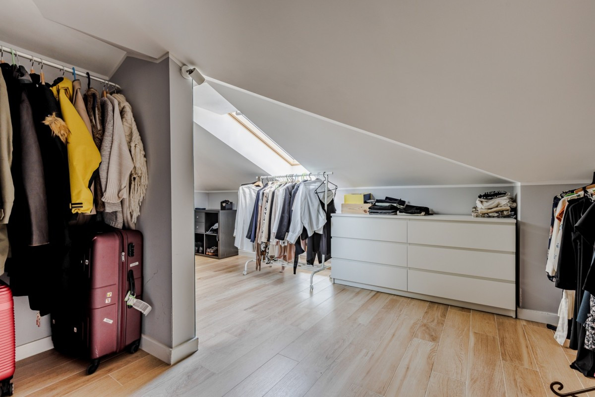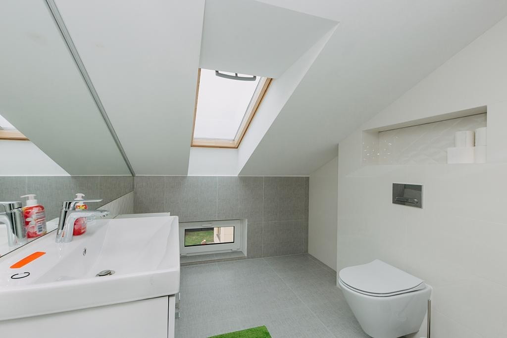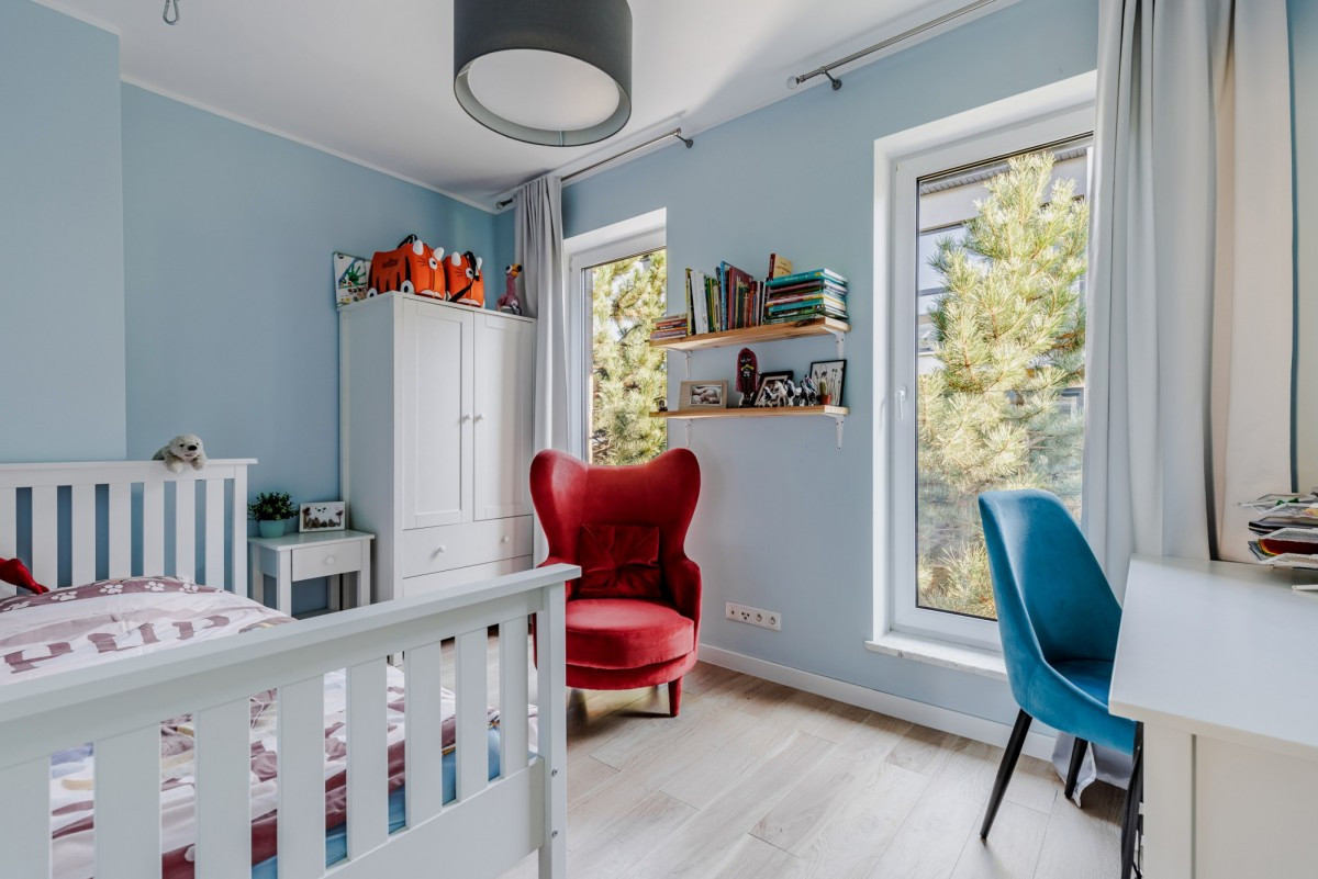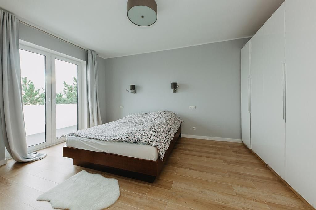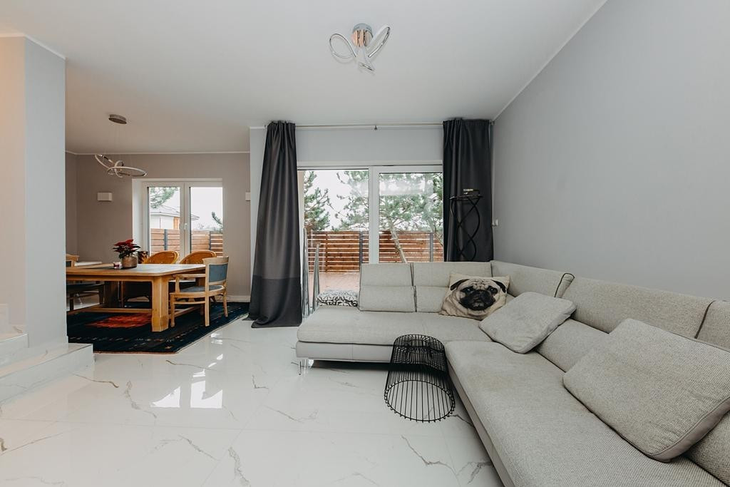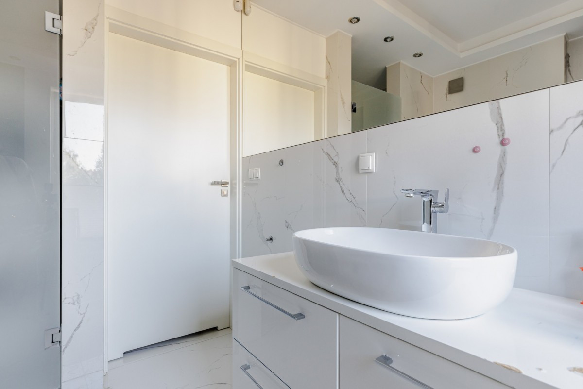 Dom wykończony jest z dbałością o detale. Doskonały rozkład pomieszczeń, przestronność jak i obfitość w naturalne światło to kolejne walory nieruchomości. W skład nieruchomości wchodzi otwarta kuchnia na salon z którego można wyjść na taras, łazienka wyposażona w wannę, druga łazienka wyposażona w prysznic, toaleta dla gości, sypialnia typu master, dwie sypialnie dziecięce, oraz sypialnia gościnna na poddaszu. Do nieruchomości przynależy również garaż.