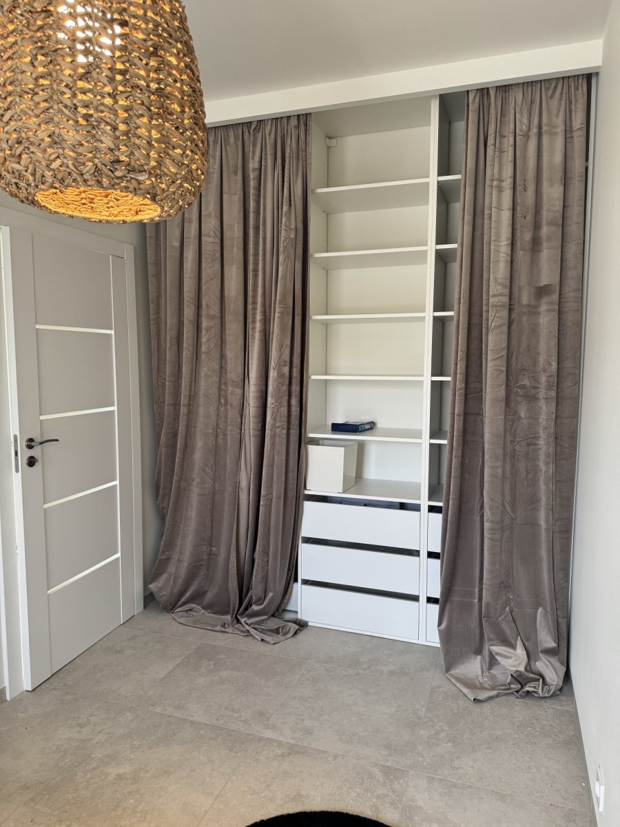 Apartament położony jest na 1. piętrze i składa się z przestronnego salonu z aneksem kuchennym wyposażonym w wysokiej klasy sprzęt AGD, przytulnej sypialni z dużą szafą w zabudowie, holu z pojemną szafą oraz łazienki z wanną i pralką.