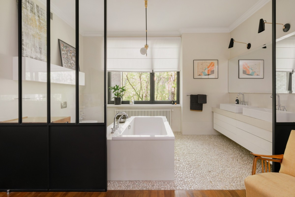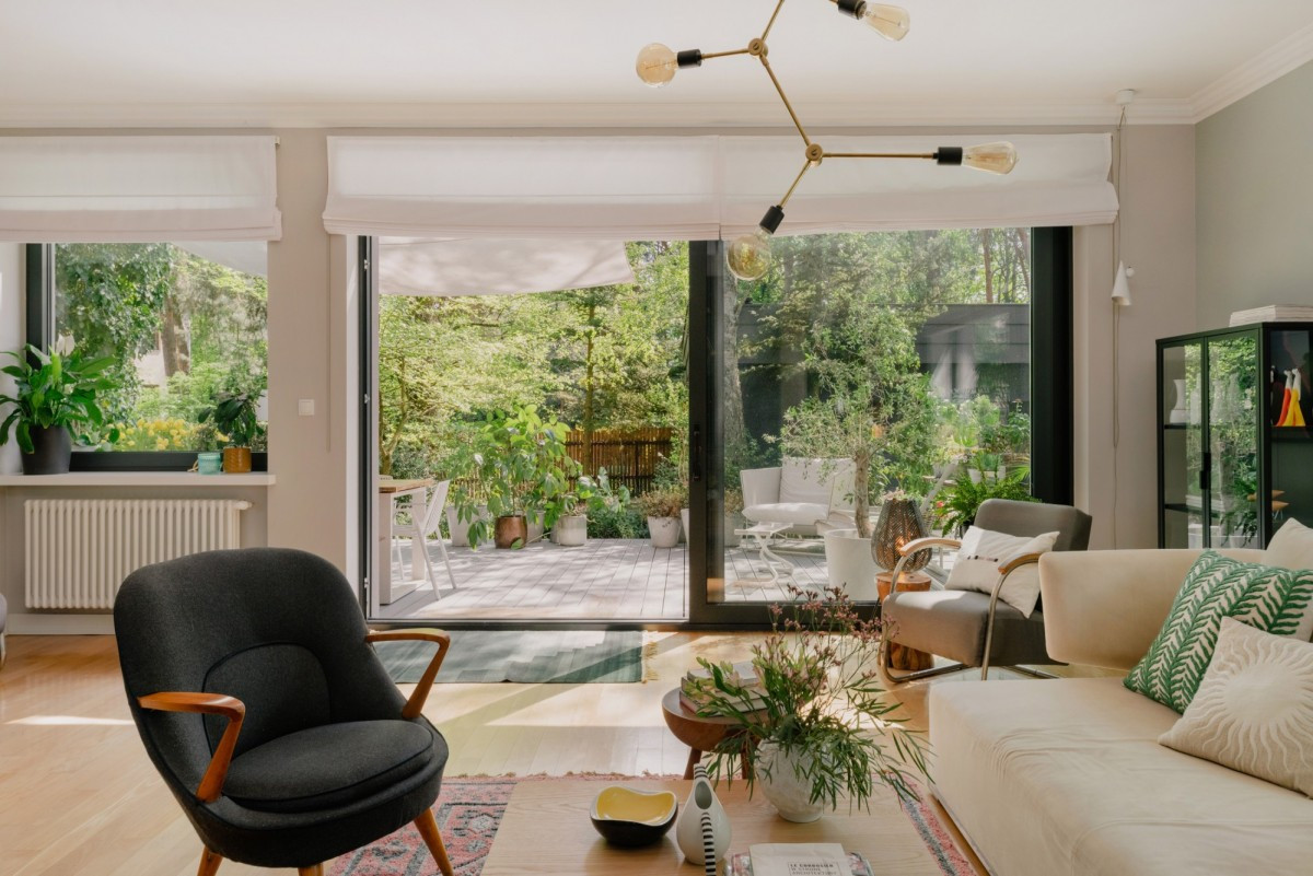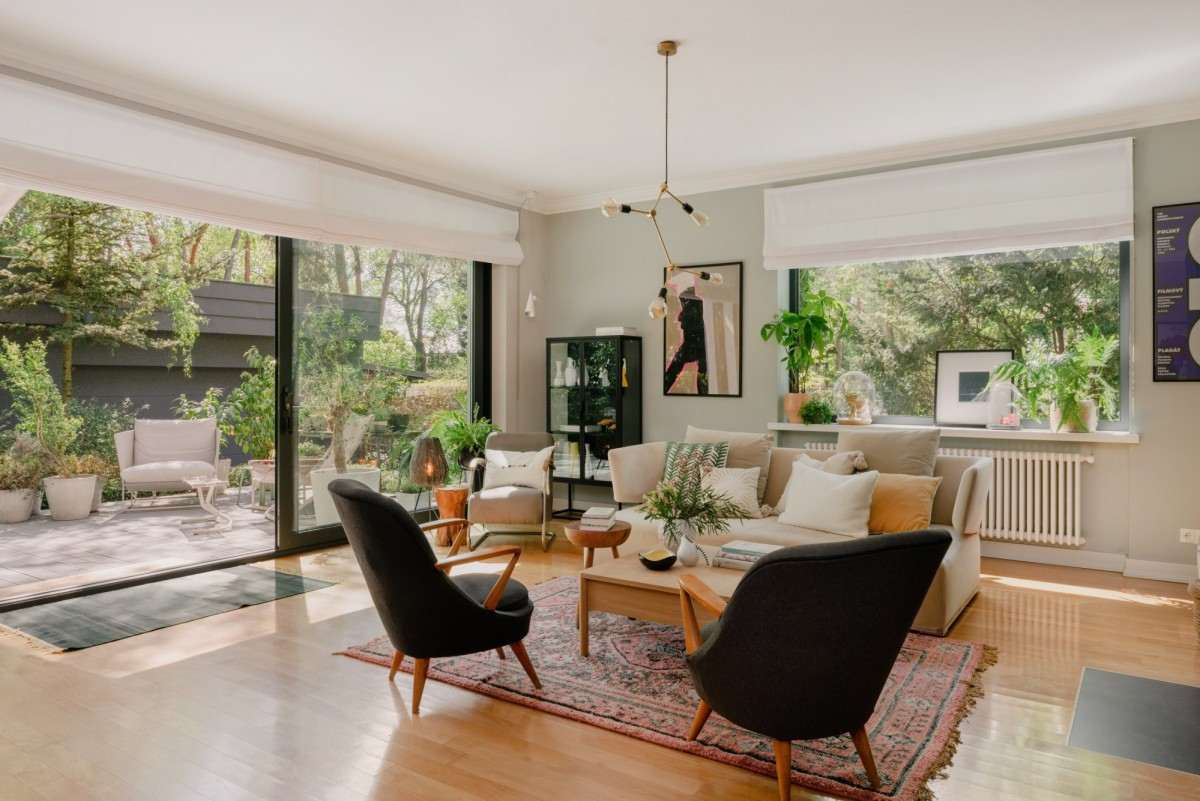 Spacious living room with division into a TV area and library and a lounge area with fireplace and access to the terrace leading to the garden. Sliding panoramic windows, providing excellent interior lighting. It is possible to completely separate these zones.