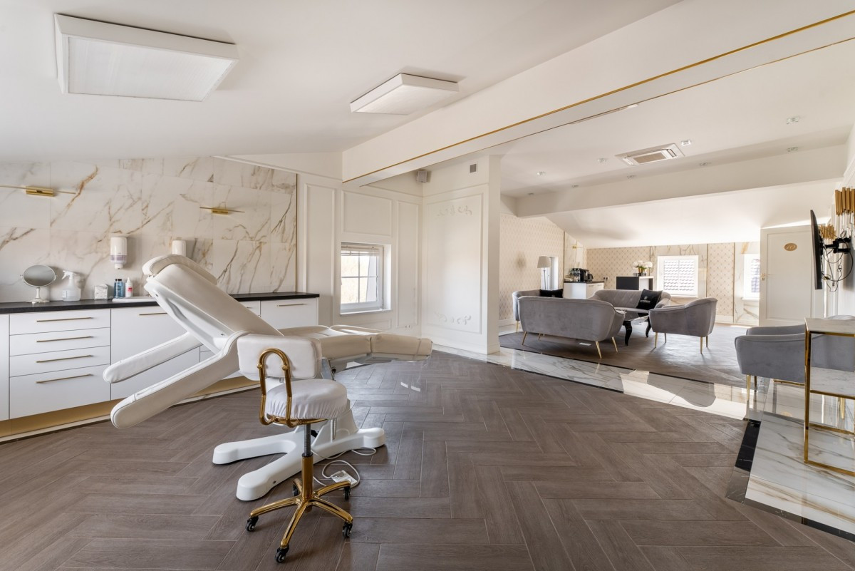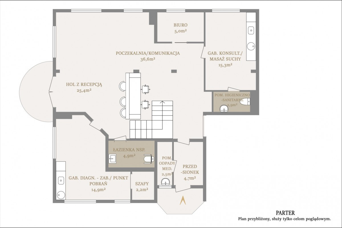 Parter to przestronny hol z recepcją, poczekalnia z eleganckimi fotelami i panoramicznymi oknami z wyjściem na ogród, gabinet z wewnętrzną toaletą, gabinet z wyjściem na ogród i wewnętrzną toaletą, sterylizatornia, pomieszczenie socjalne, mini kuchnia, osobna toaleta dla Klientów. Za recepcją mieści się wejście dla pracowników oraz dodatkowe pomieszczenie socjalne.
