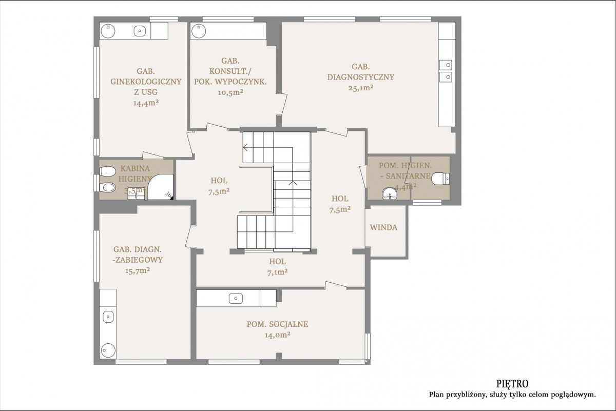 Klinika medyczna posiadająca wszystkie pozwolenia na prowadzenie działalności medycznej, składa się z parteru i dwóch pięter.
