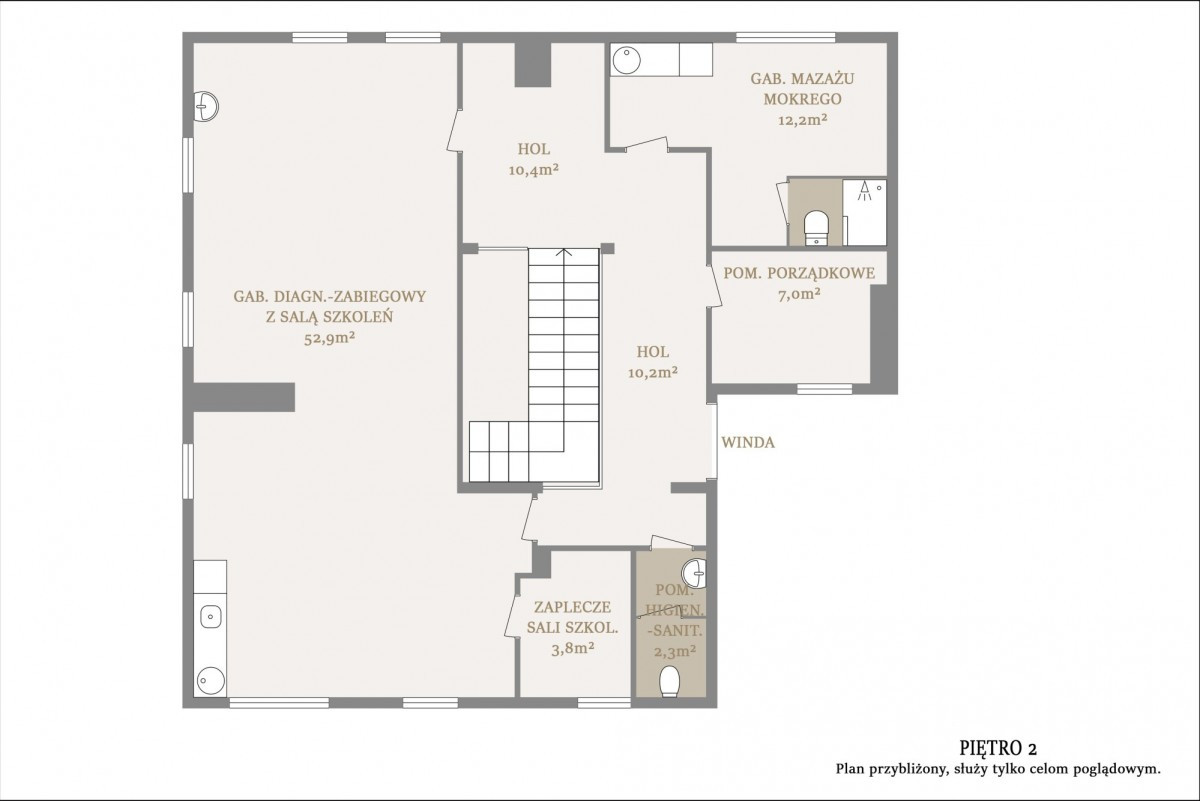Piętro 2 to przestronna sala konferencyjna wraz z łazienką i prysznicem, w której mogą być prowadzone szkolenia, konferencje lub wykonywane zabiegi, gabinet lekarski z prysznicem, pomieszczenie techniczne i osobna toaleta dla Klientów.
