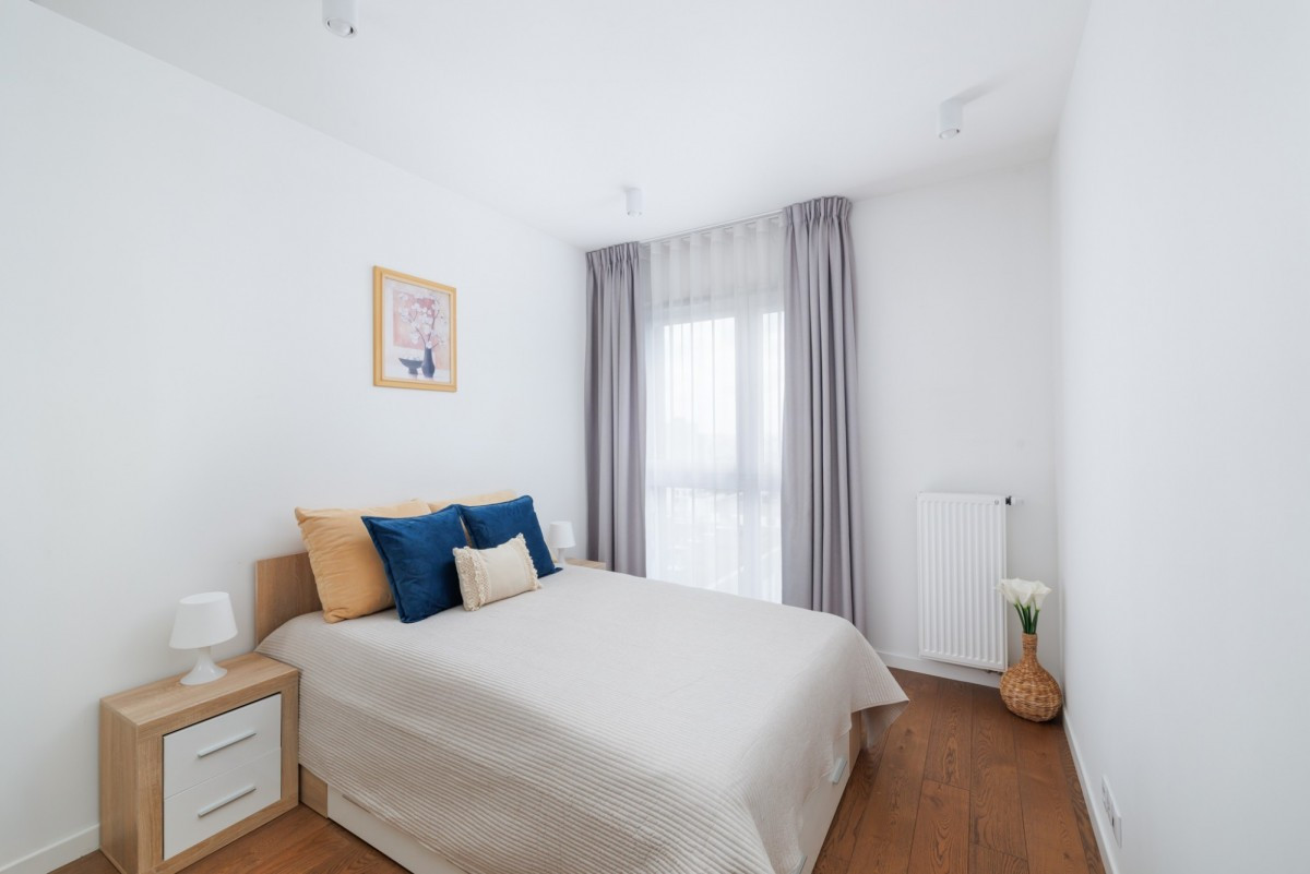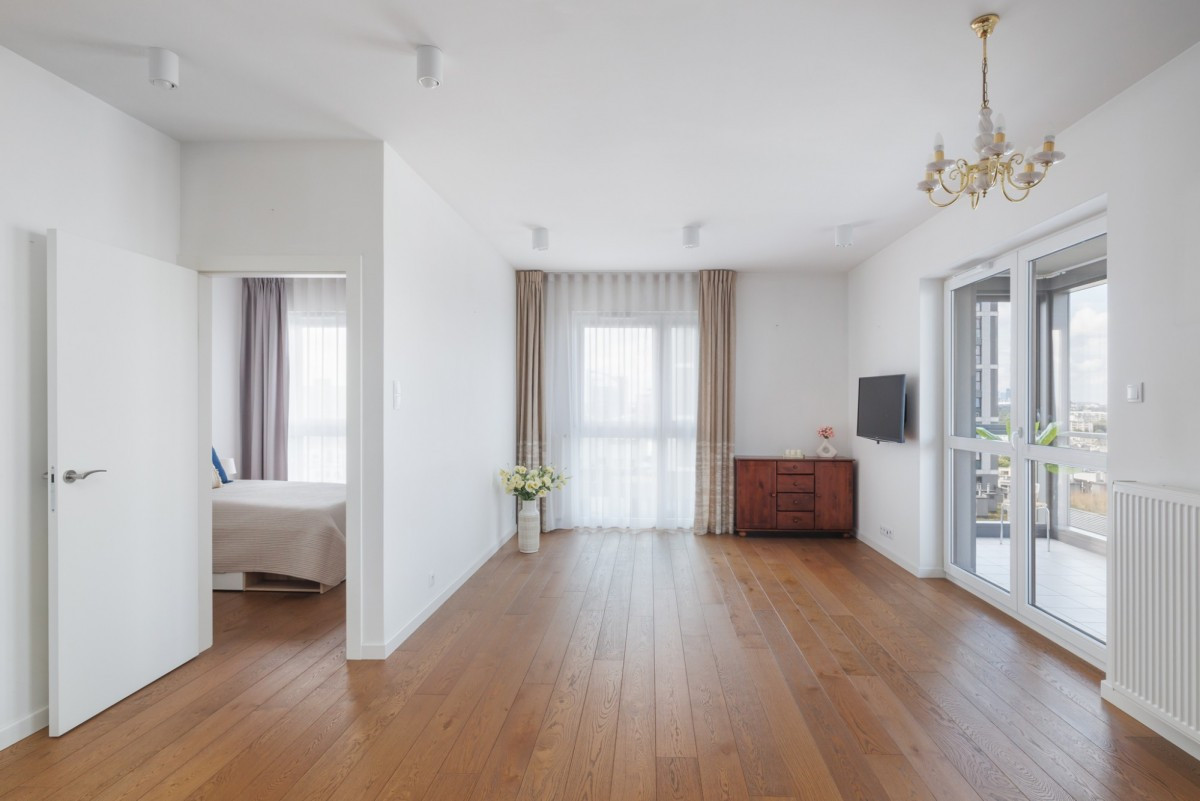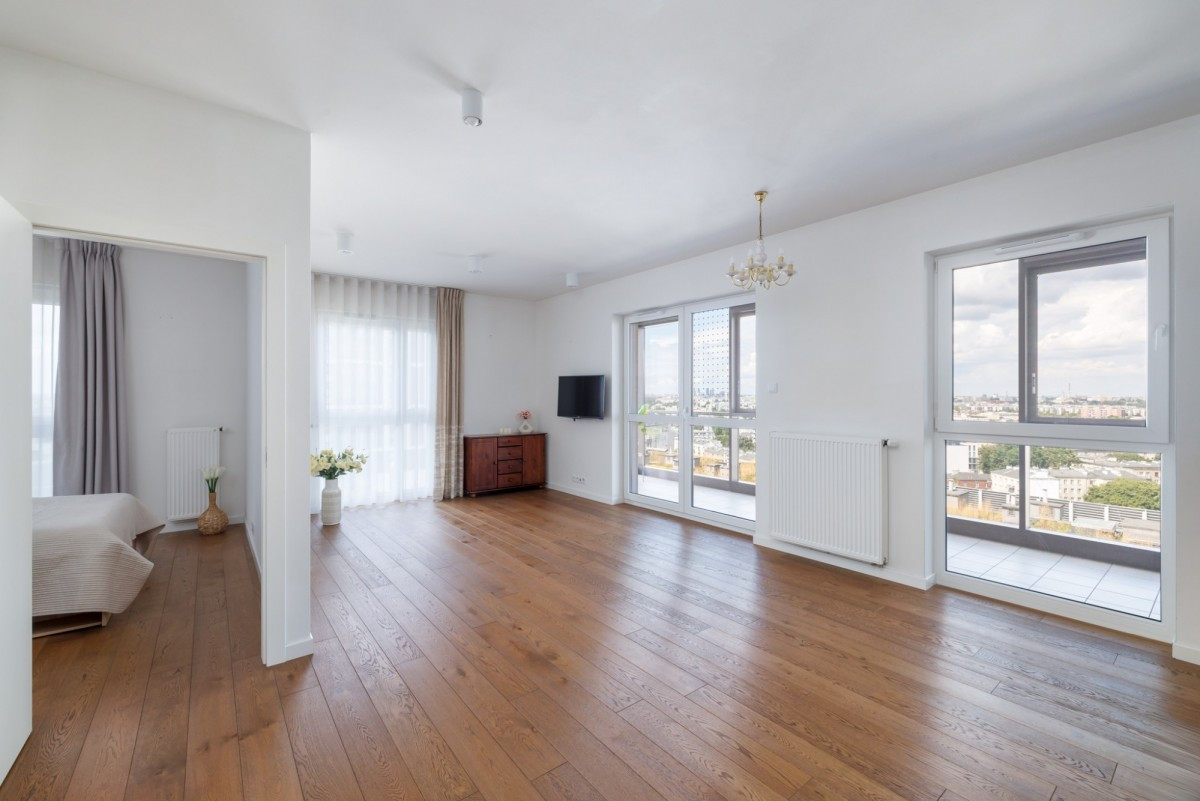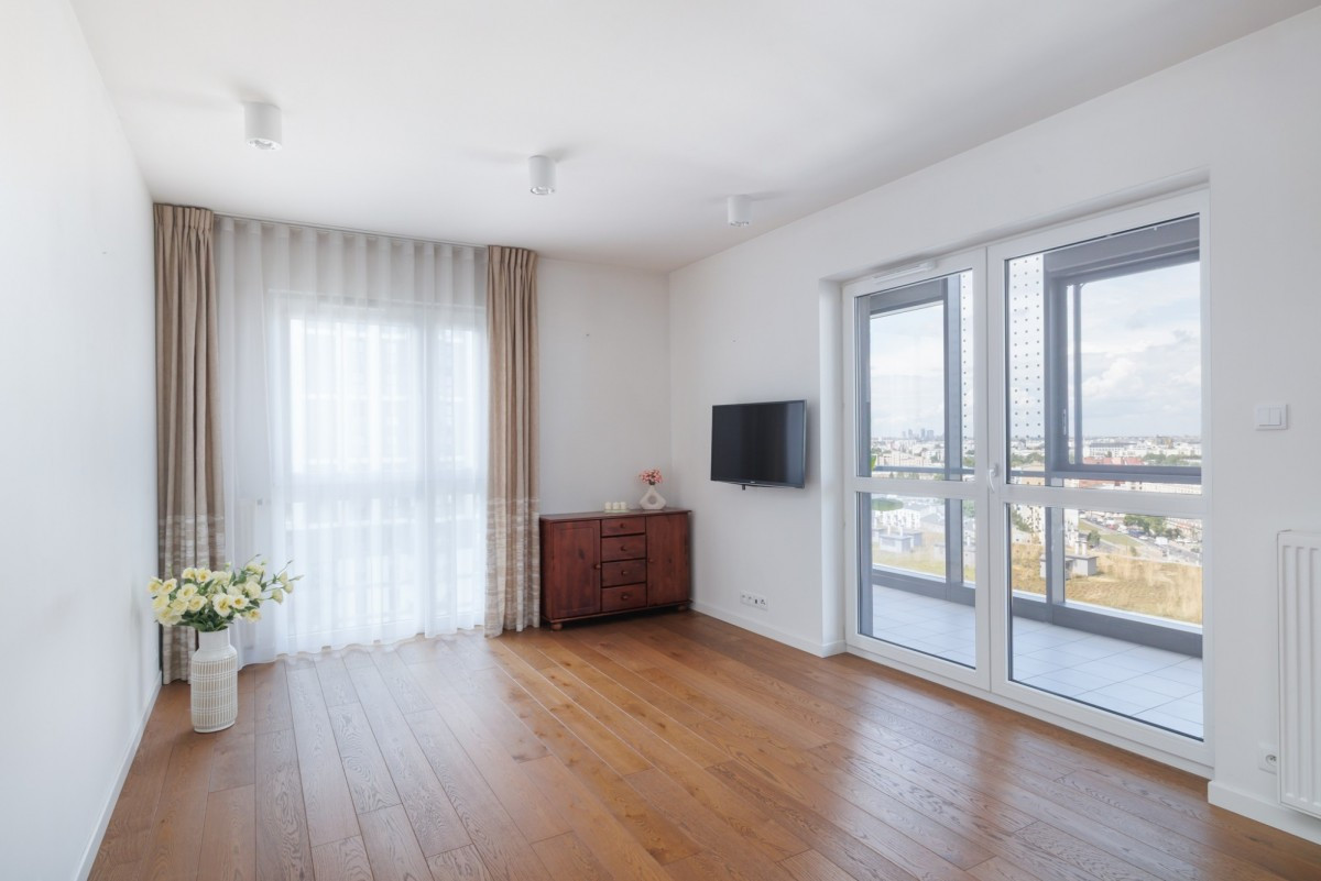 Nowoczesne, przestronne mieszkanie z dużą przeszkloną loggią (14,3 m²) i panoramicznym widokiem na Warszawę. 12. piętro w apartamentowcu z 2018 r., z windą, ochroną i monitoringiem.