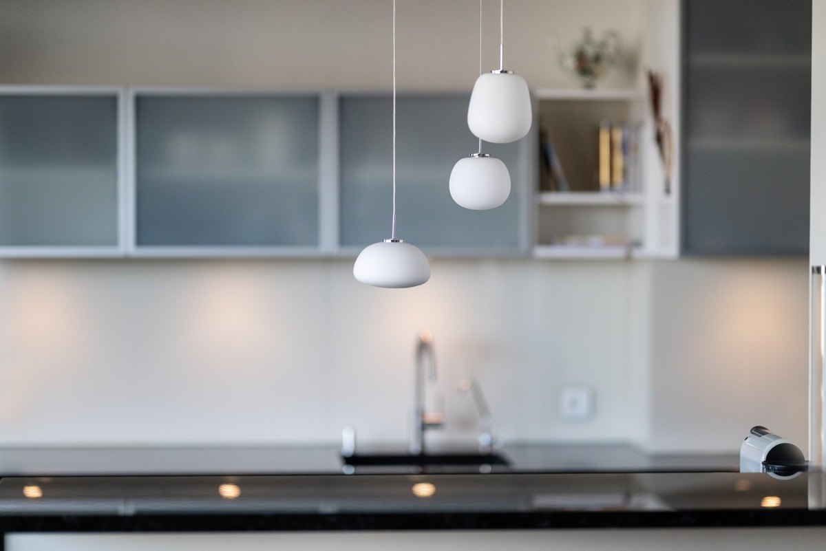 - Kitchen with an island, semi-open to the living room