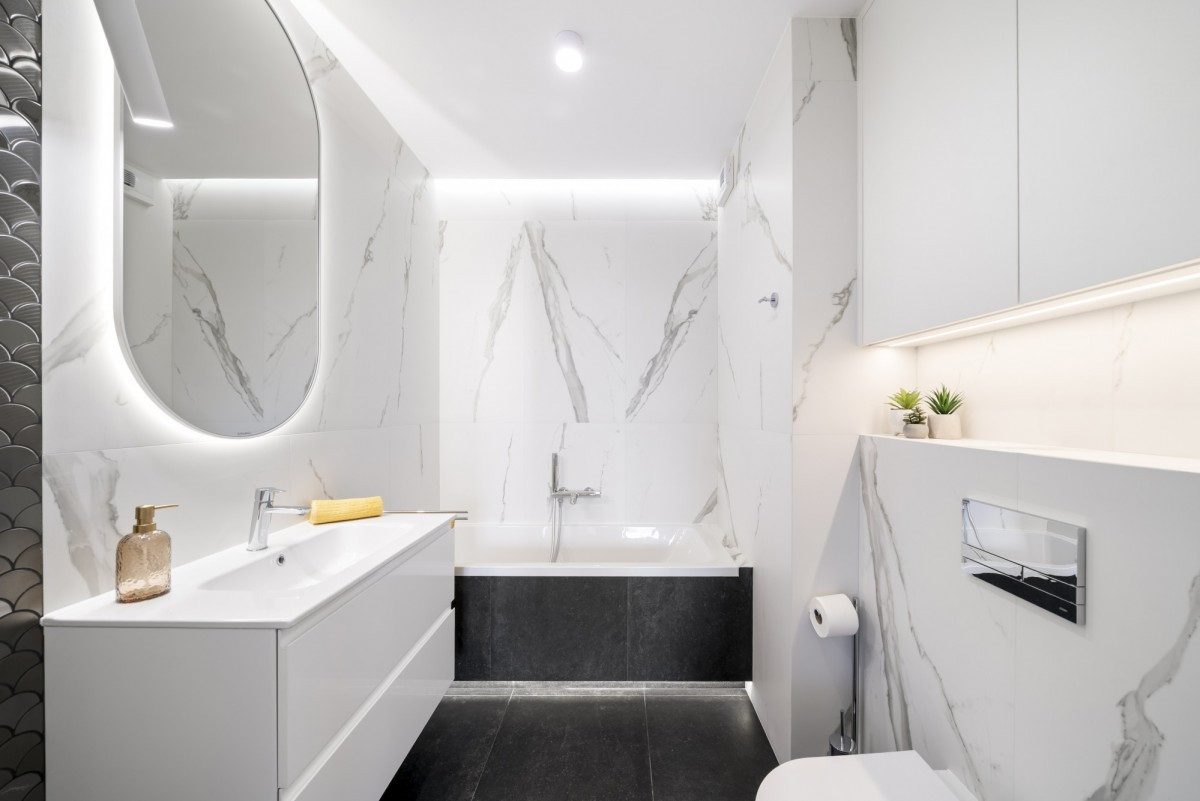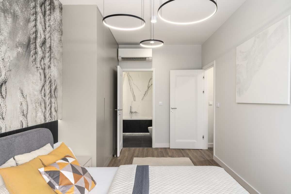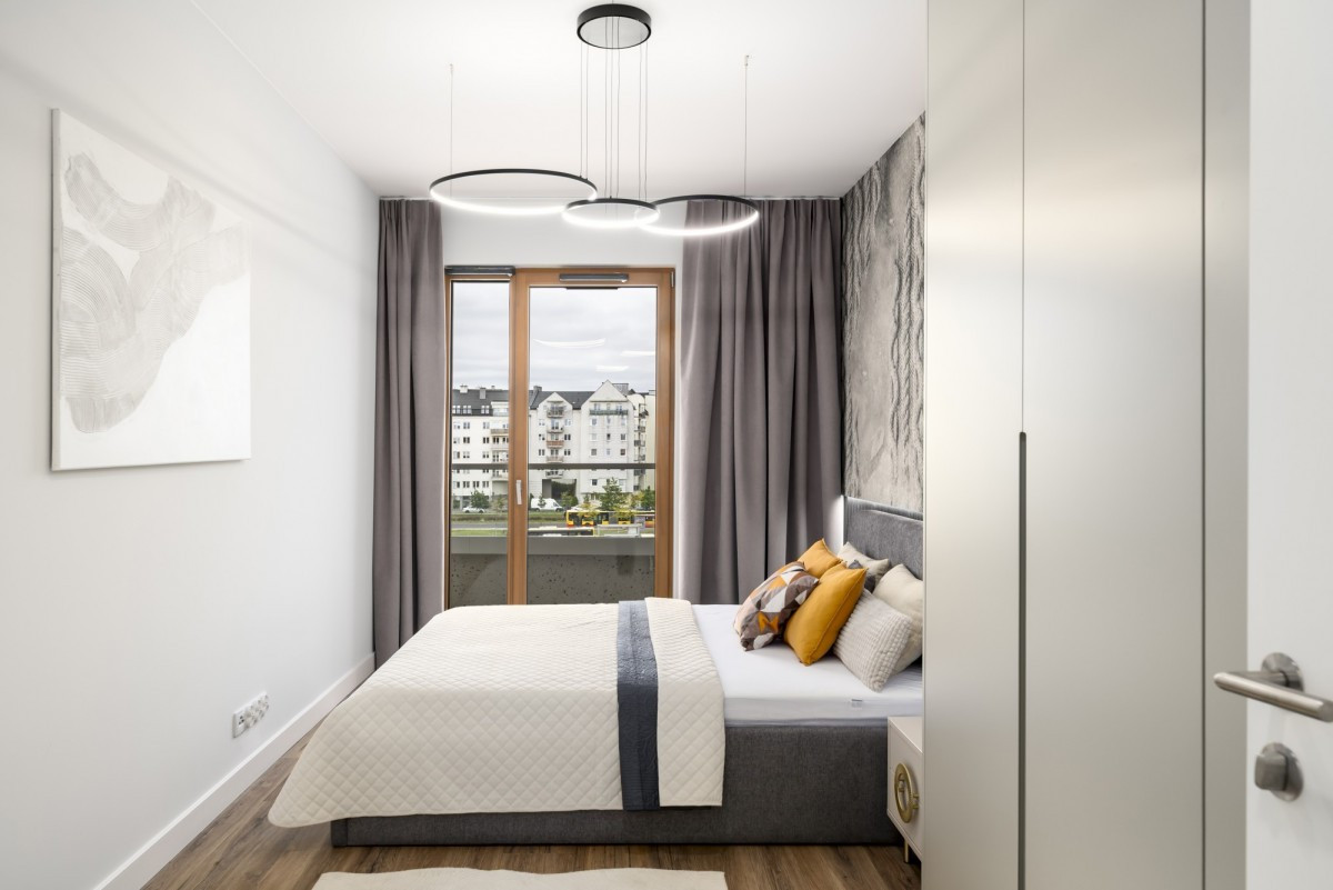 Salon z otwartą kuchnią i jadalnią umeblowany, główna sypialnia umeblowana, druga sypialnia (alternatywnie gabinet, pokój dziecka/nastolatka lub pokój gościnny) umeblowana, w tym zabudowa stała szaf ściennych na wymiar, telewizor na zapytanie najemcy.