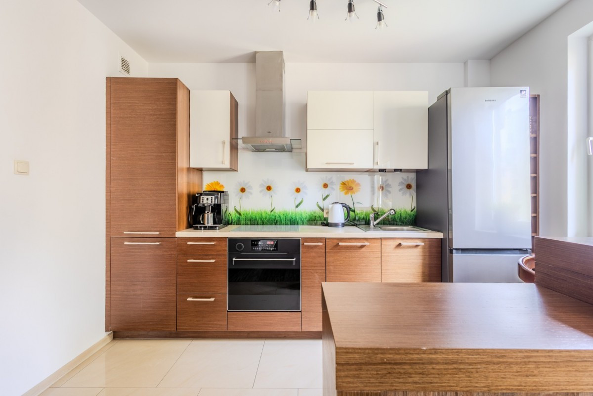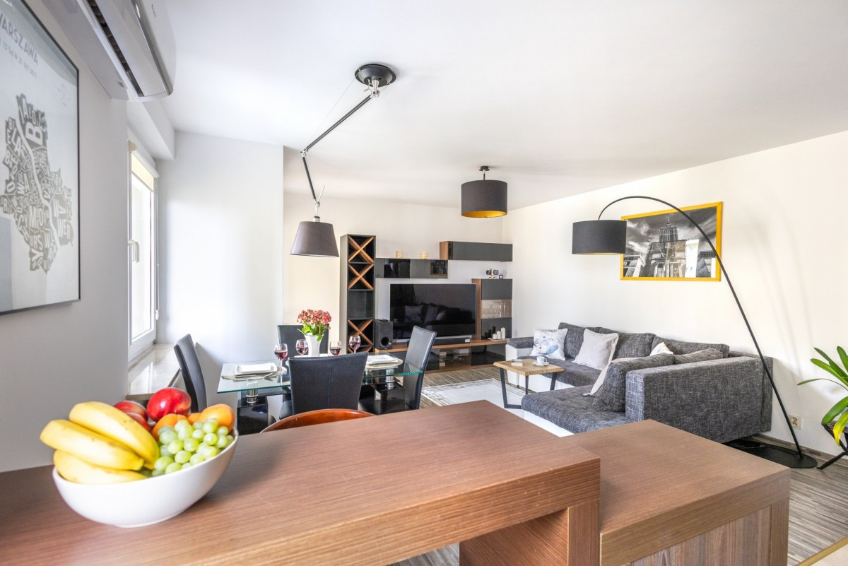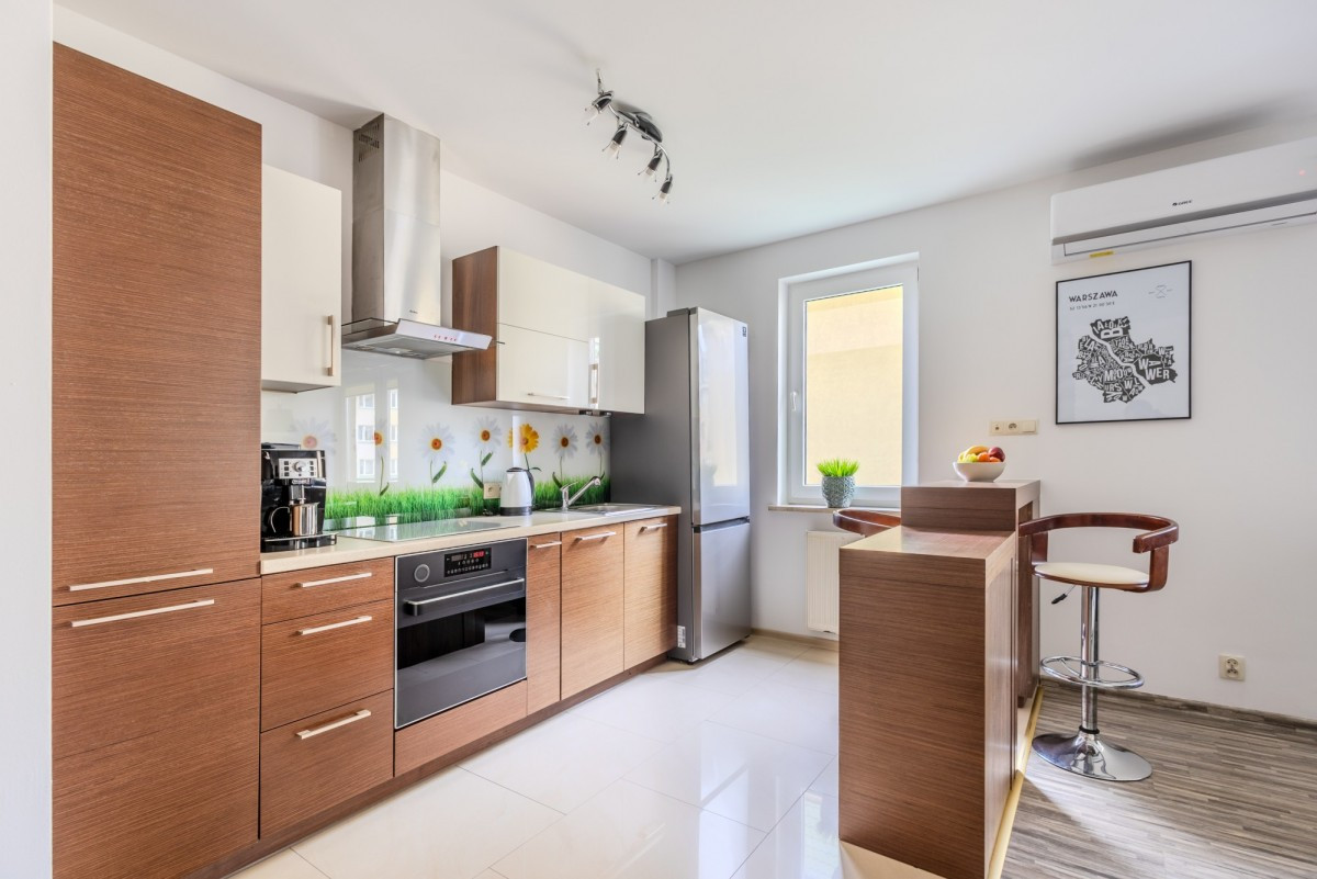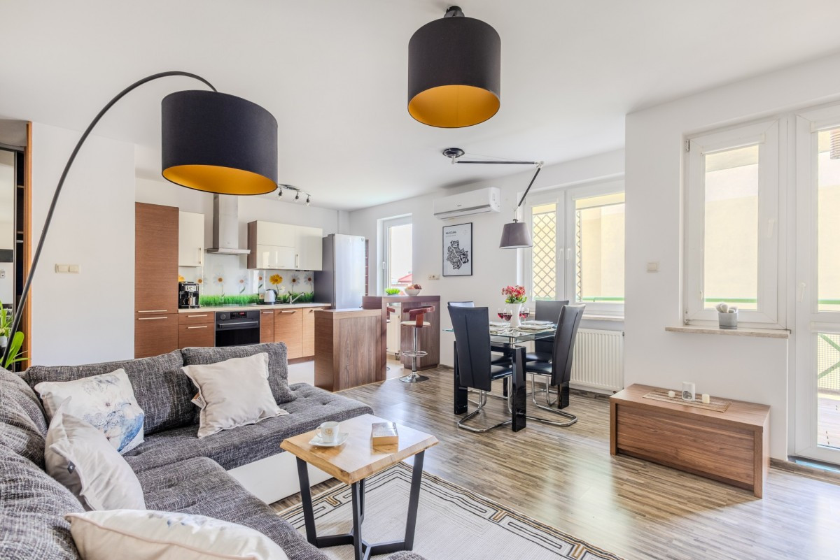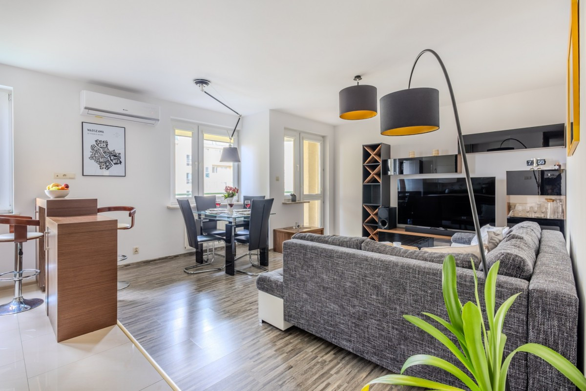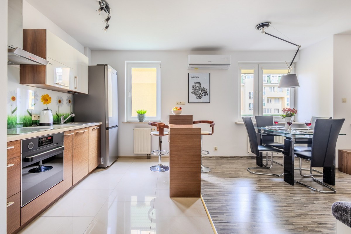 Mieszkanie jest w pełni umeblowane (meble w cenie mieszkania, istnieje też możliwość usunięcia mebli na życzenie), wyposażone w klimatyzację oraz sprzęt AGD: lodówka, płyta indukcyjna, piekarnik, okap, zmywarka i pralka.