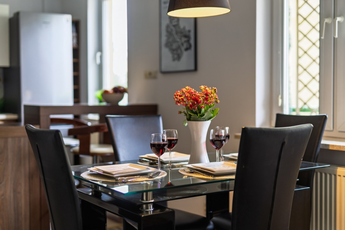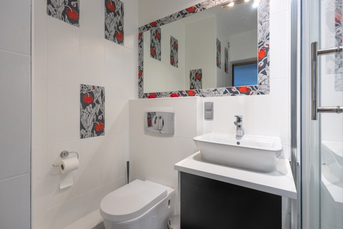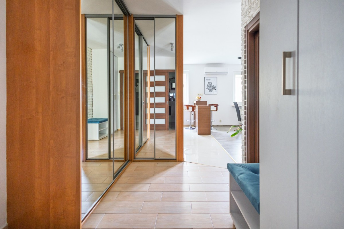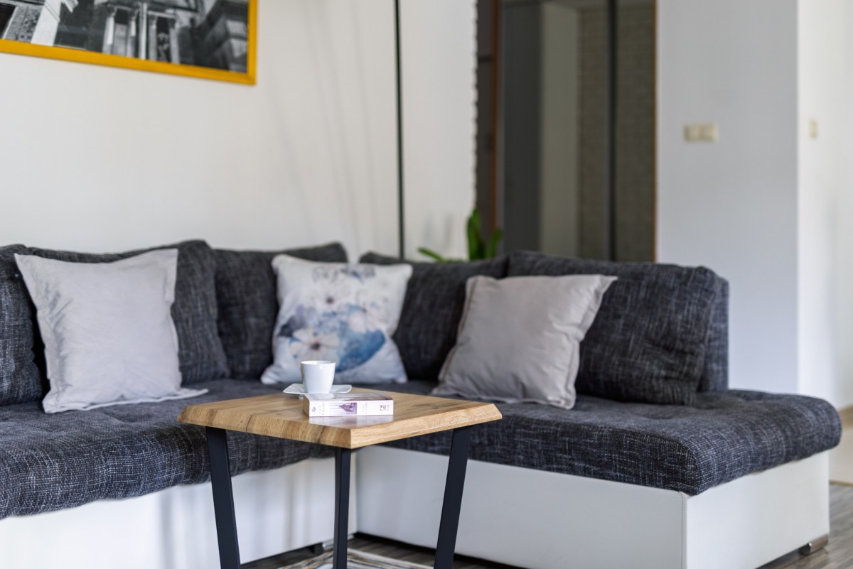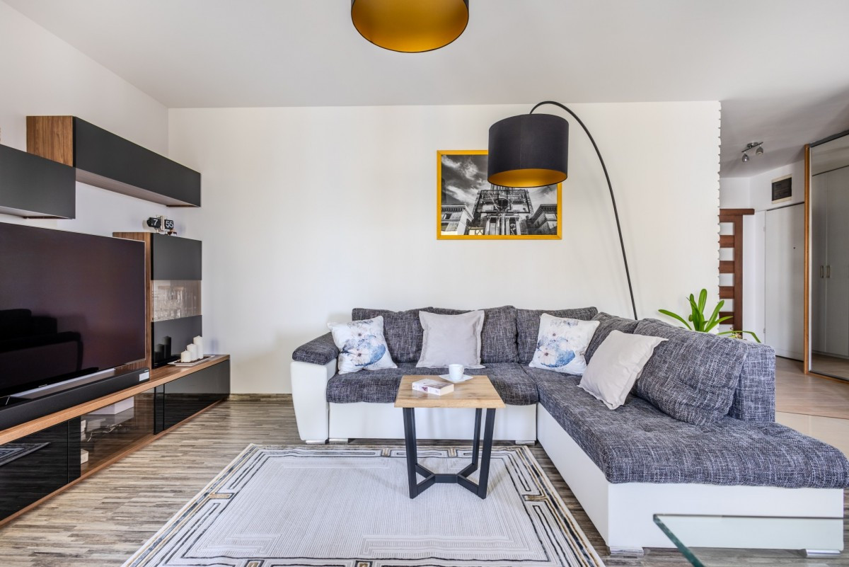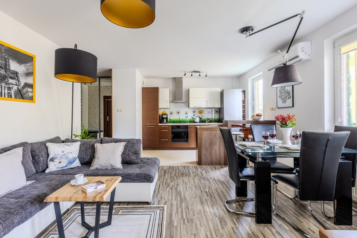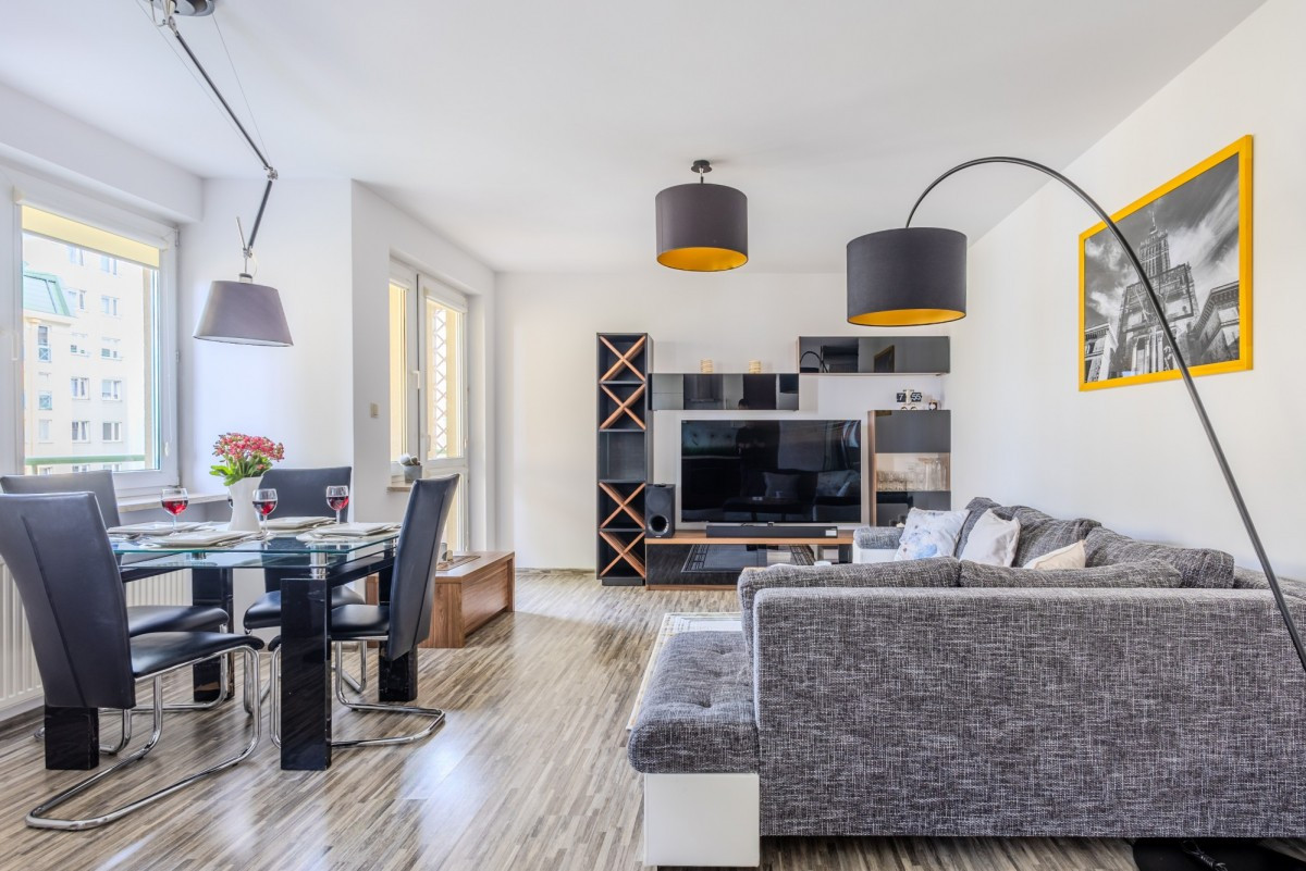 Mieszkanie jest w pełni umeblowane (meble w cenie mieszkania, istnieje też możliwość usunięcia mebli na życzenie), wyposażone w klimatyzację oraz sprzęt AGD: lodówka, płyta indukcyjna, piekarnik, okap, zmywarka i pralka.