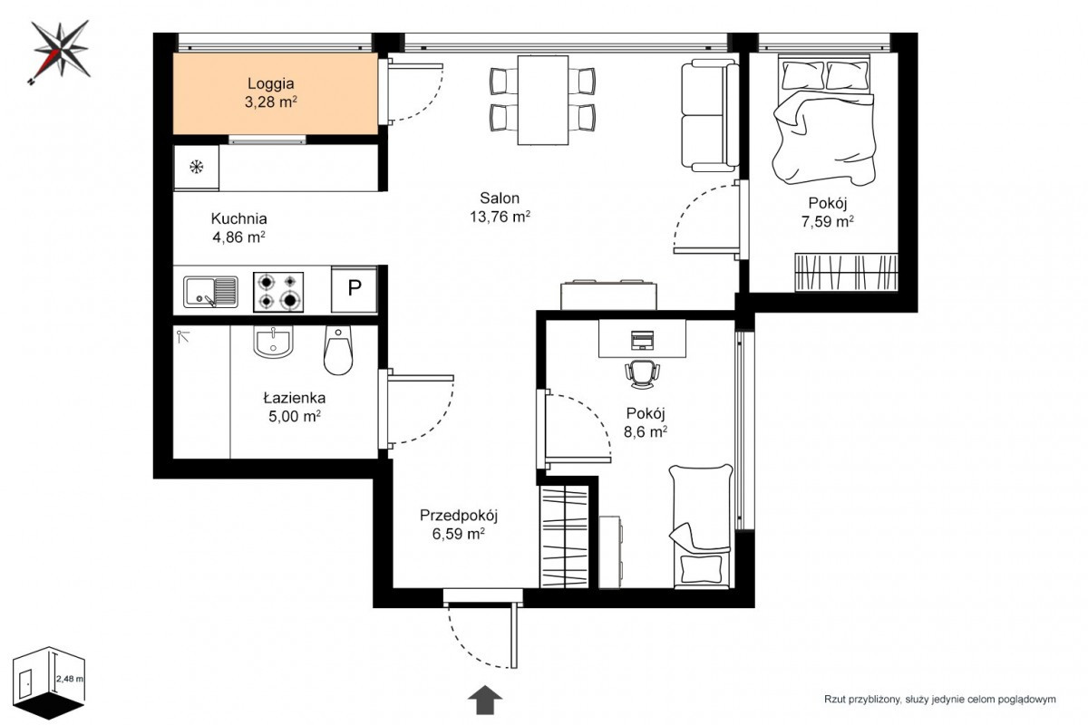serce mieszkania, czyli ustawny, dobrze doświetlony i przejściowy salon o pow. ok. 13,76 mkw, z którego prowadzi wyjście na balkon typu loggia o pow. ok. 3,28 mkw,