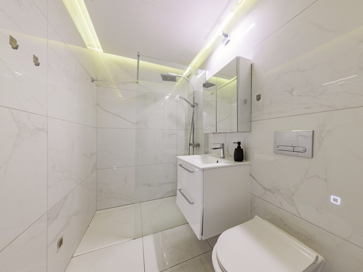 łazienka z wc, umywalką i prysznicem liniowym o pow. ok. 5 mkw,