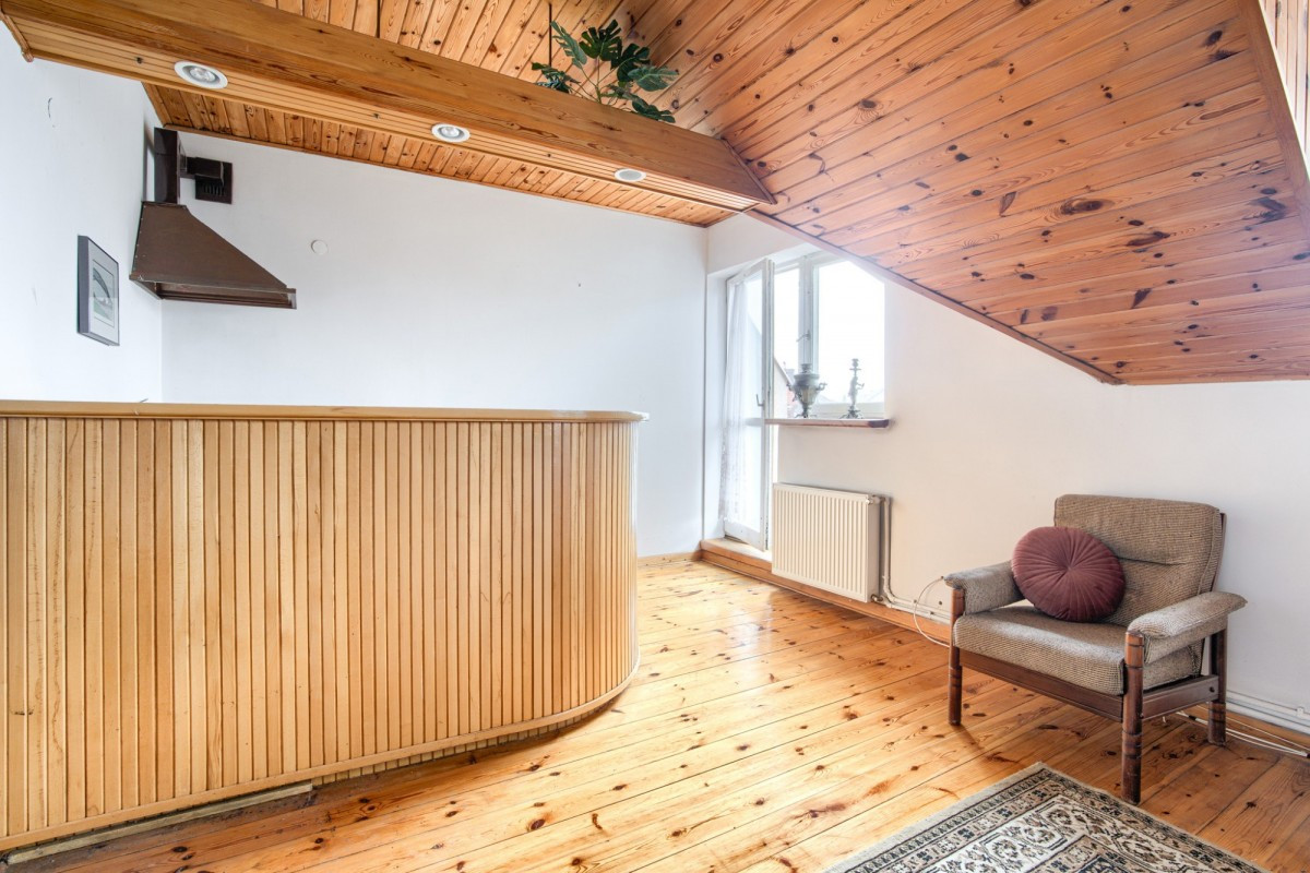 Parter zapewnia przestronną otwartą przestrzeń, idealną na biuro, elegancki salon, lub miejsce spotkań.