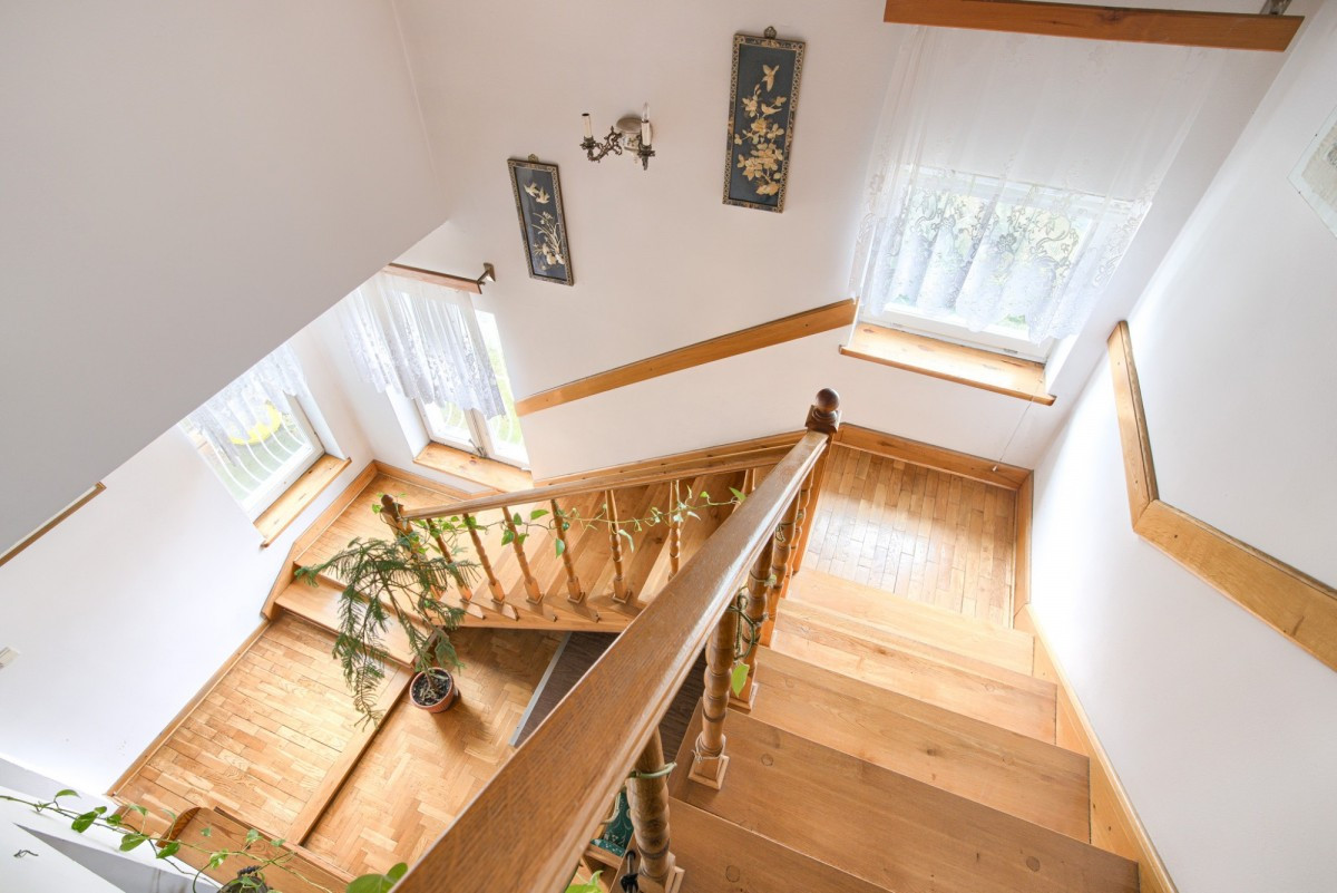 Pierwsze piętro oferuje przestrzenie zapewniające intymność i prywatność, doskonałe na strefę wypoczynkową lub pomieszczenia biurowe.