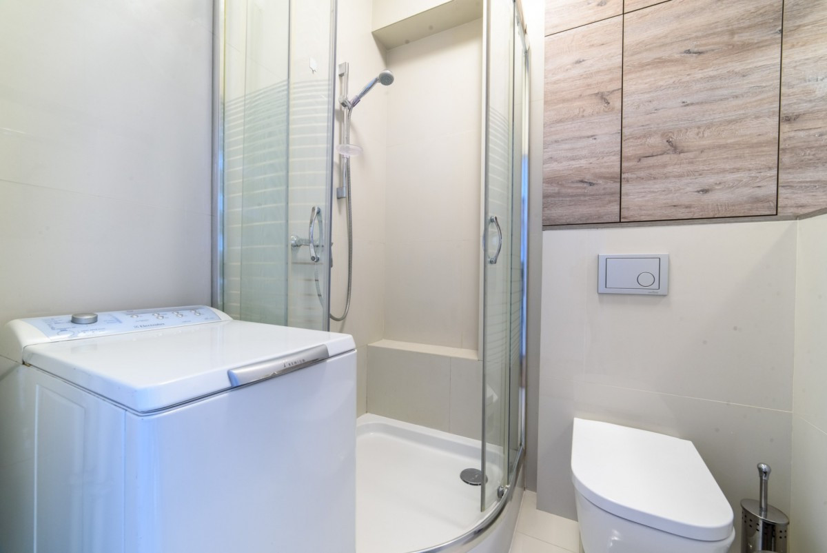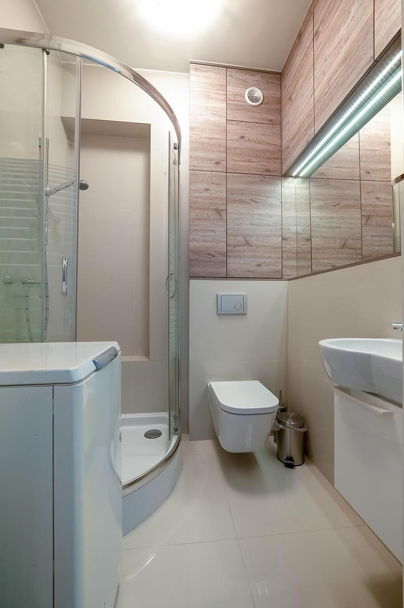 Łazienka z kabiną prysznicową i dużym lustrem oraz szafkami w zabudowie meblowej. W łazience zainstalowana jest pralka.