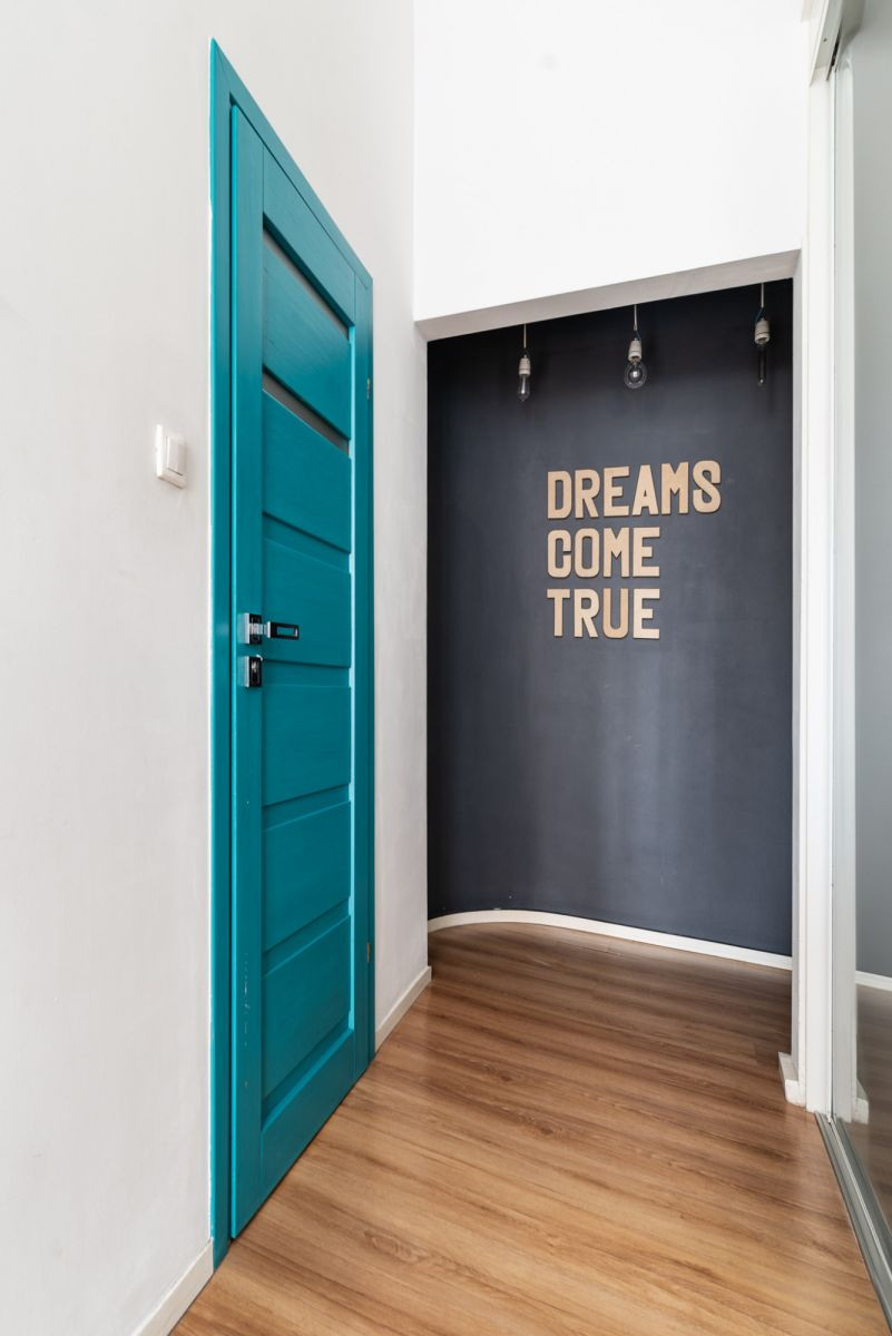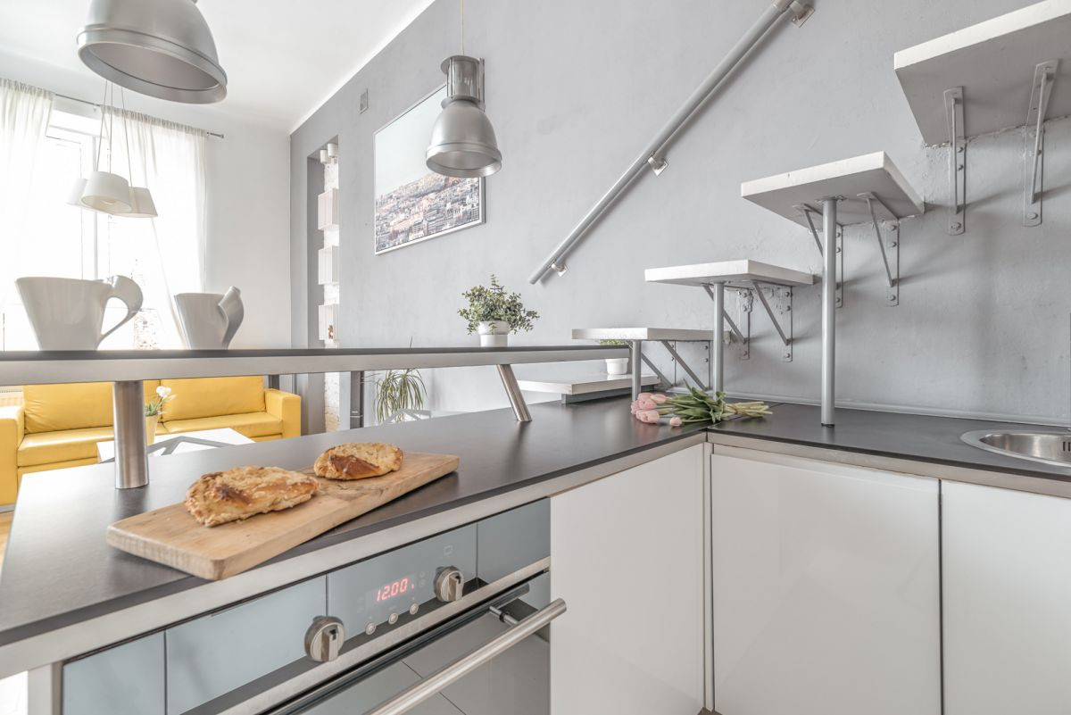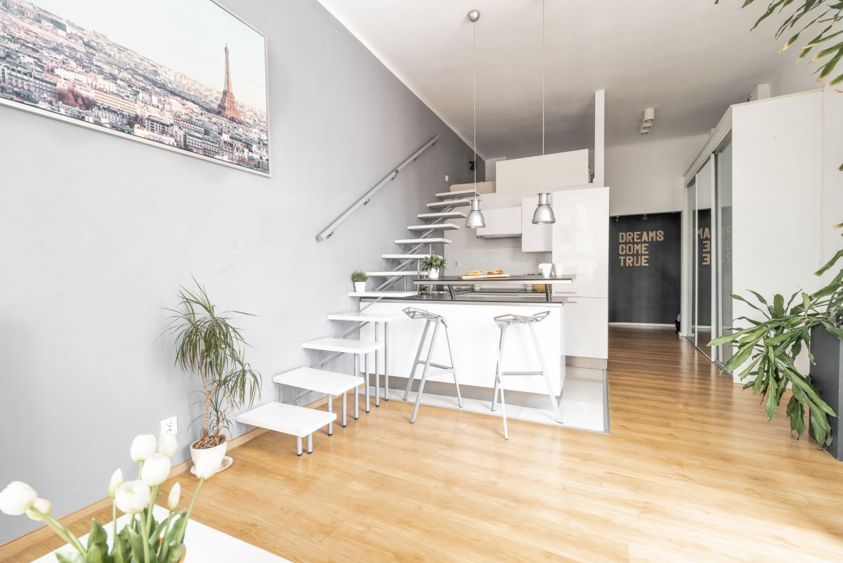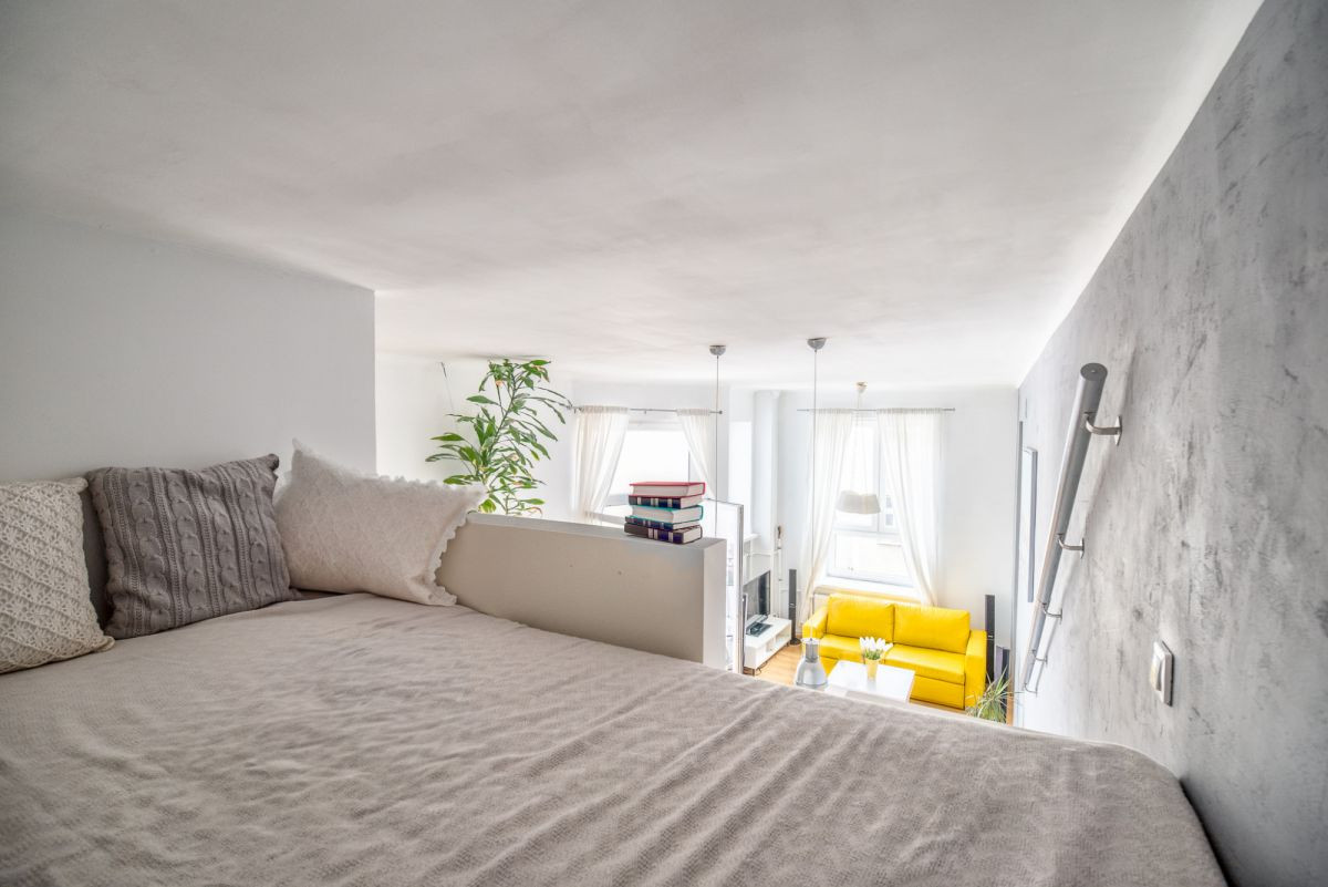 Przemyślany układ pozwala na pełne wykorzystanie dostępnej przestrzeni. Dzięki wysokim sufitom powstała antresola, która pełni funkcję sypialni, pozostawiając dolną część mieszkania jako otwartą, jasną strefę dzienną. Salon z aneksem kuchennym prowadzi na balkon, skąd można podziwiać urokliwe podwórko. Dodatkowo w mieszkaniu znajduje się ustawna łazienka oraz przedpokój z praktyczną szafą.