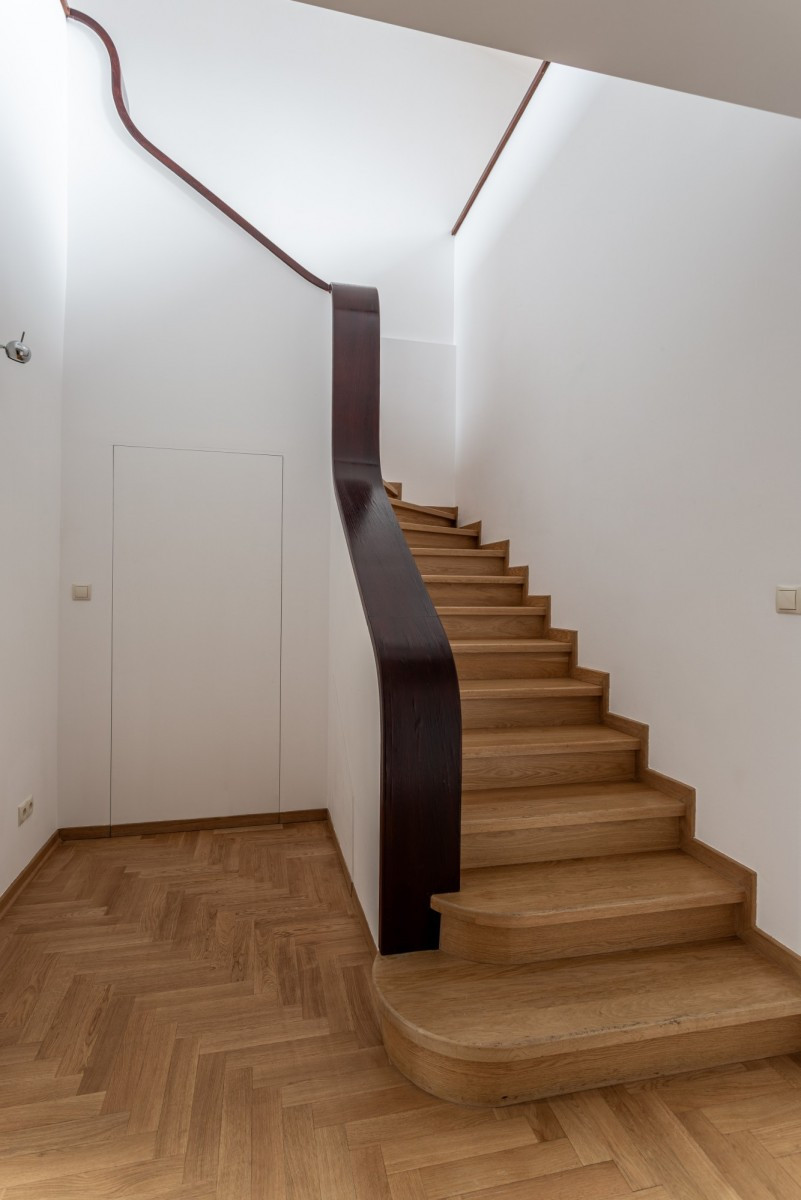 Apartament ma dwustronną ekspozycję (światło z dwóch stron) i zajmuje dwa ostatnie piętra kamienicy.