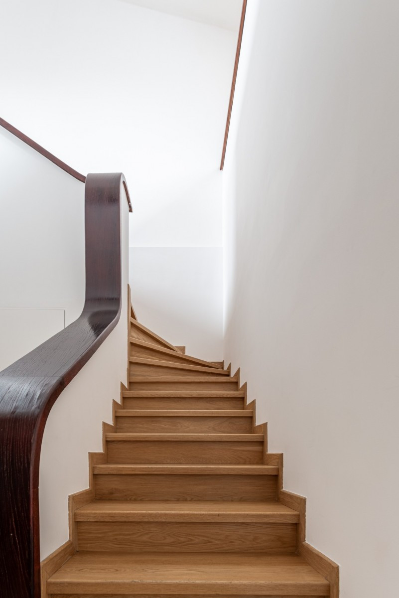 A spacious hallway with an impressive staircase finished with a modernist wooden balustrade welcomes you into the interior.