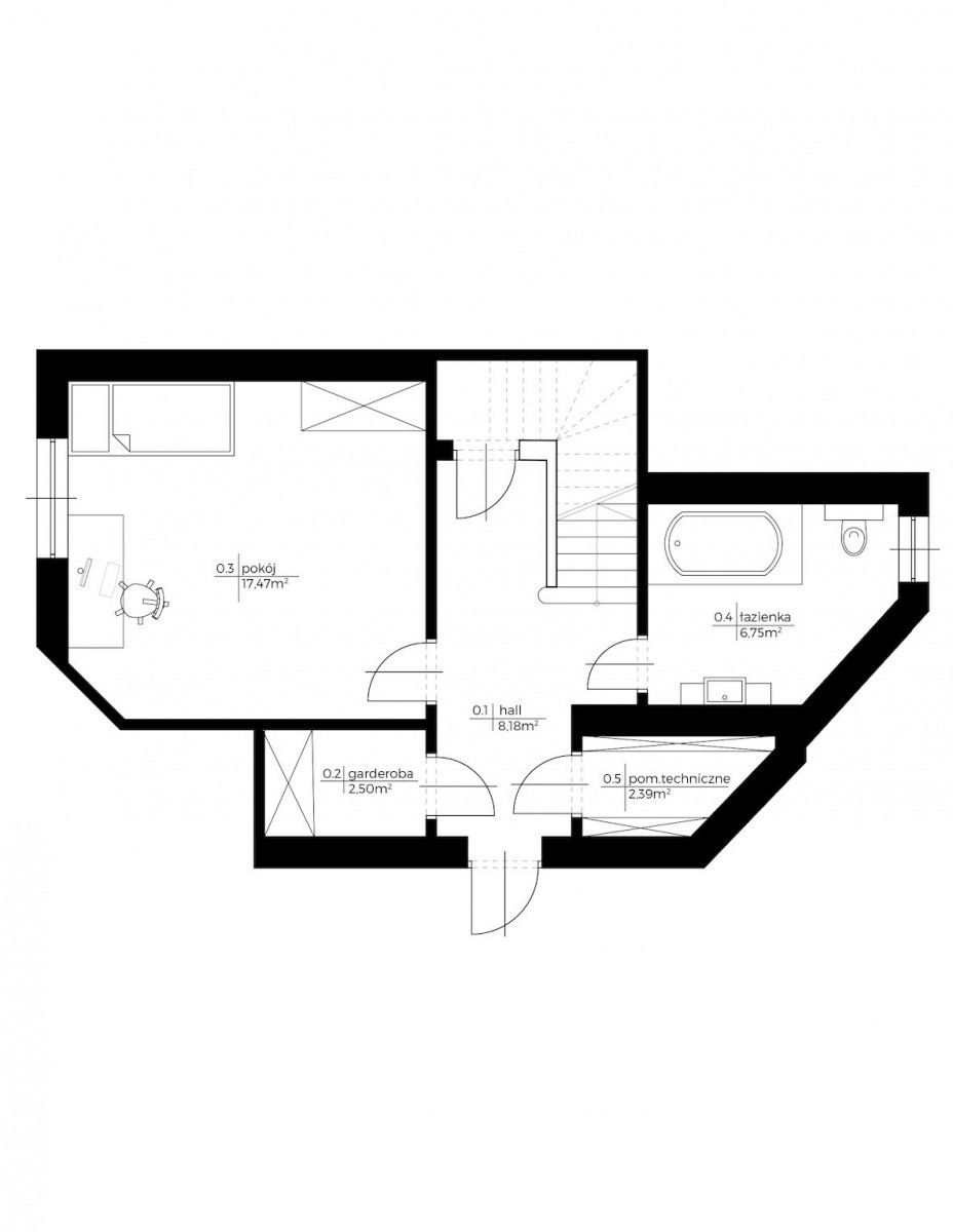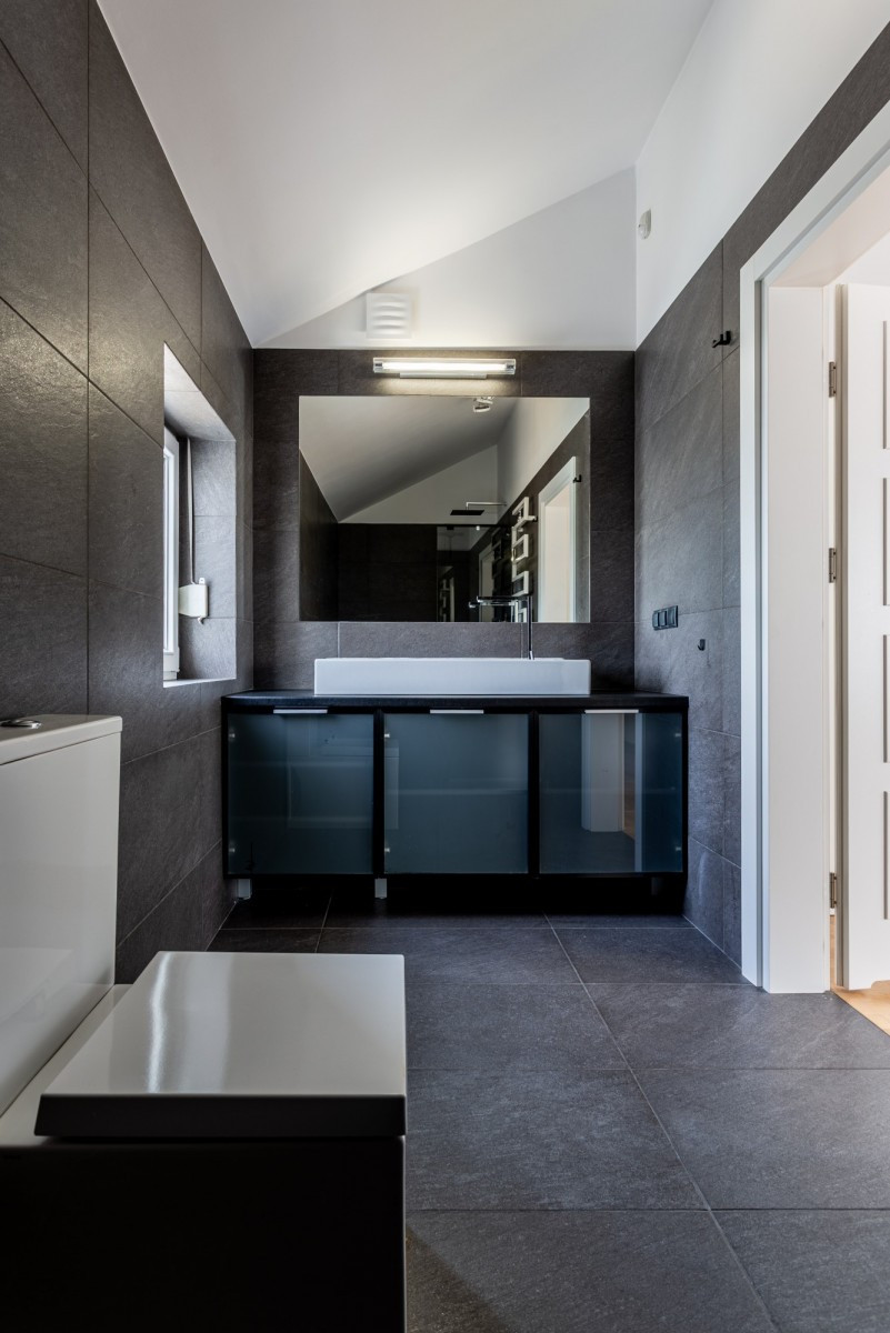 Na poziomie dolnym znajduje się: duży pokój, łazienka z wanną, schowek, przestronna garderoba i pomieszczenie techniczne.