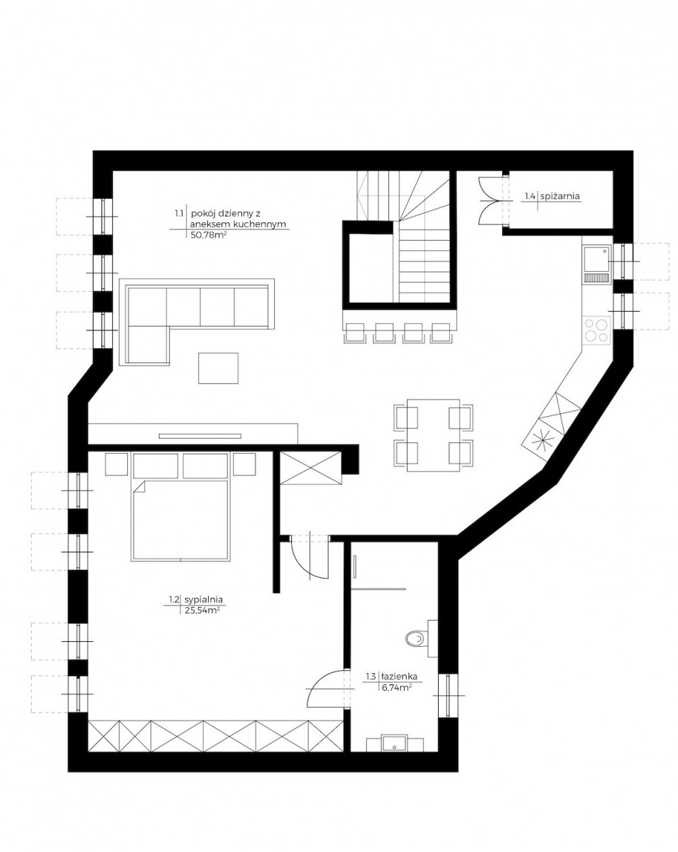 Poziom górny (najwyższe piętro) składa się z: pokoju dziennego z aneksem kuchennym i jadalni, spiżarni, przestronnej sypialni oraz łazienki z prysznicem.