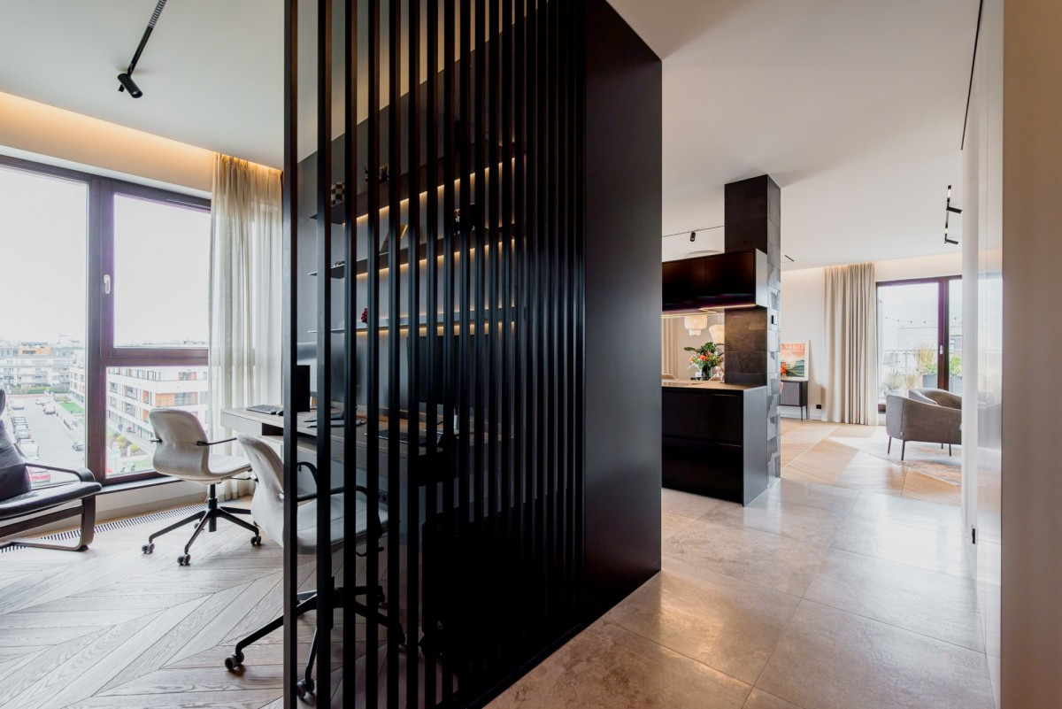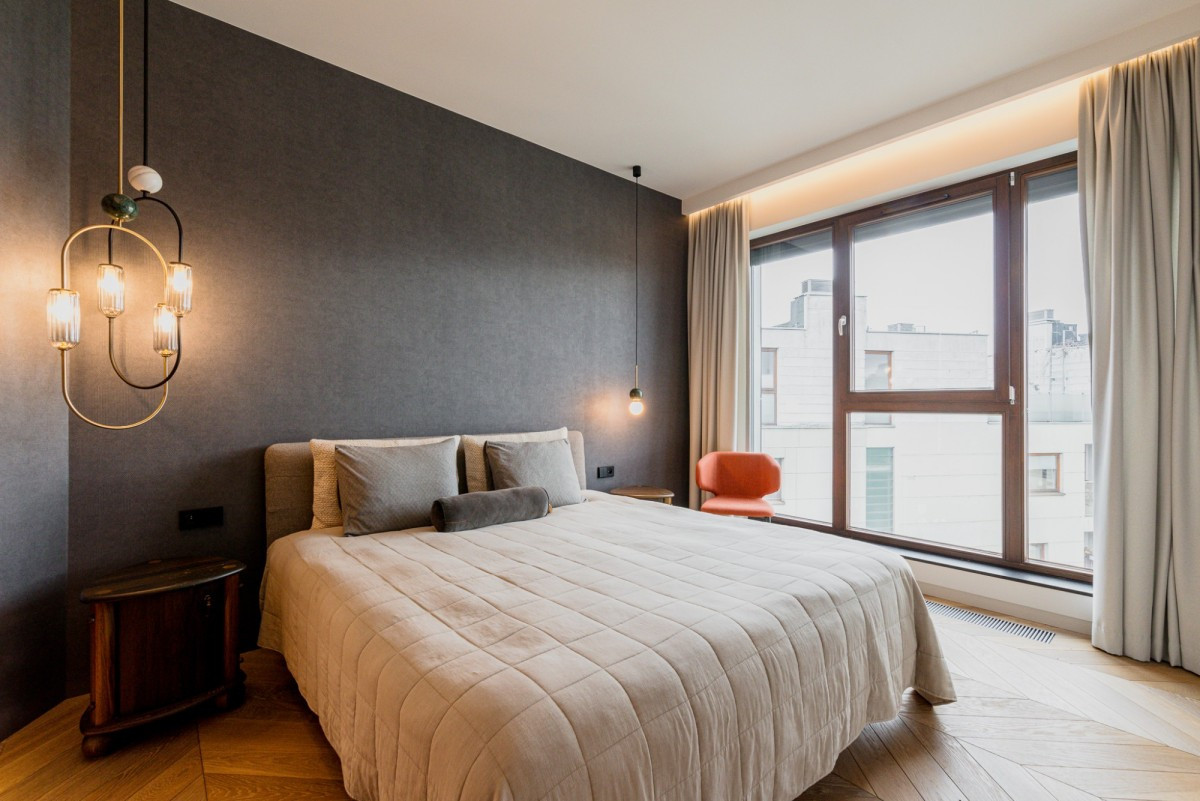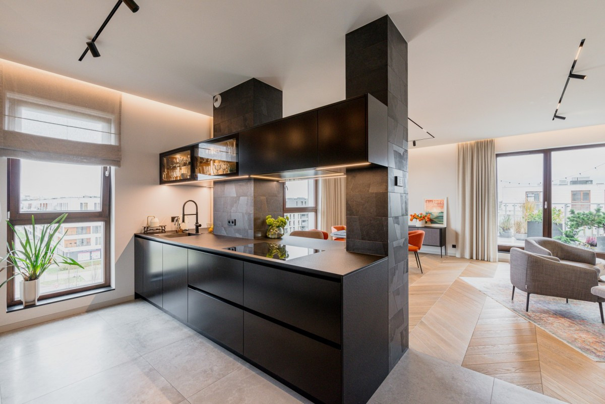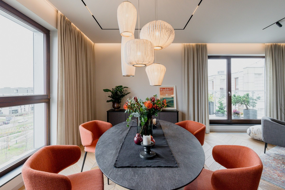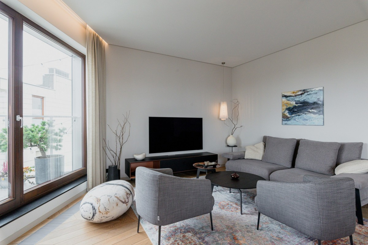 The penthouse is located on the top floor of a modern apartment building on Oś Królewska, in the Błonia Wilanowskie neighborhood. It is an ideal place for those who value comfort, space, and privacy. Designed by an architect with attention to detail and ergonomics, the apartment offers ceilings up to 2.9 m high, enhancing the sense of spaciousness, while the smart home system ensures everyday convenience.