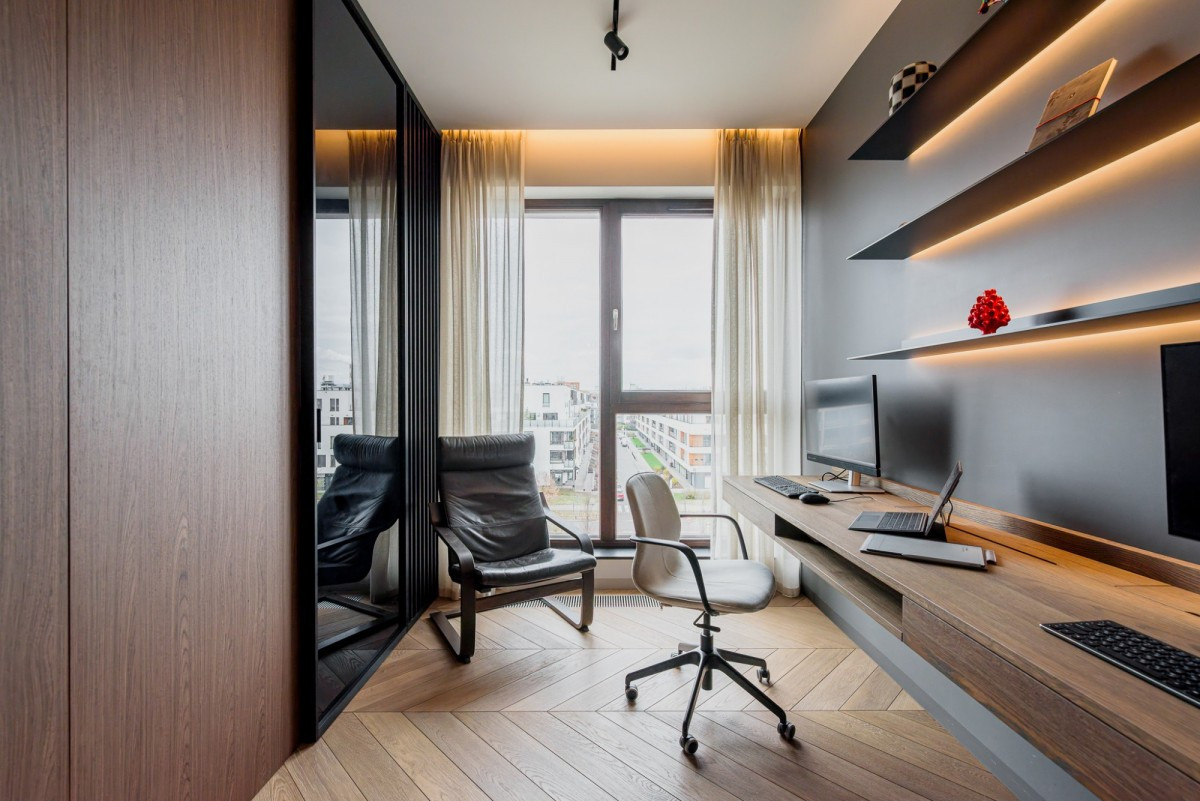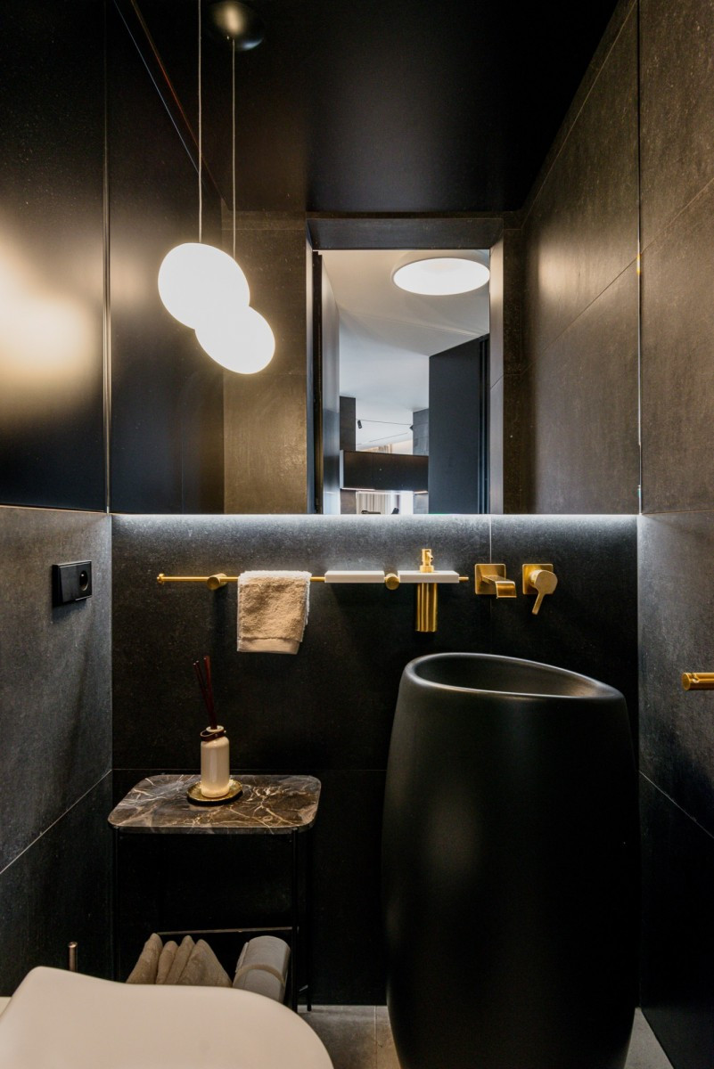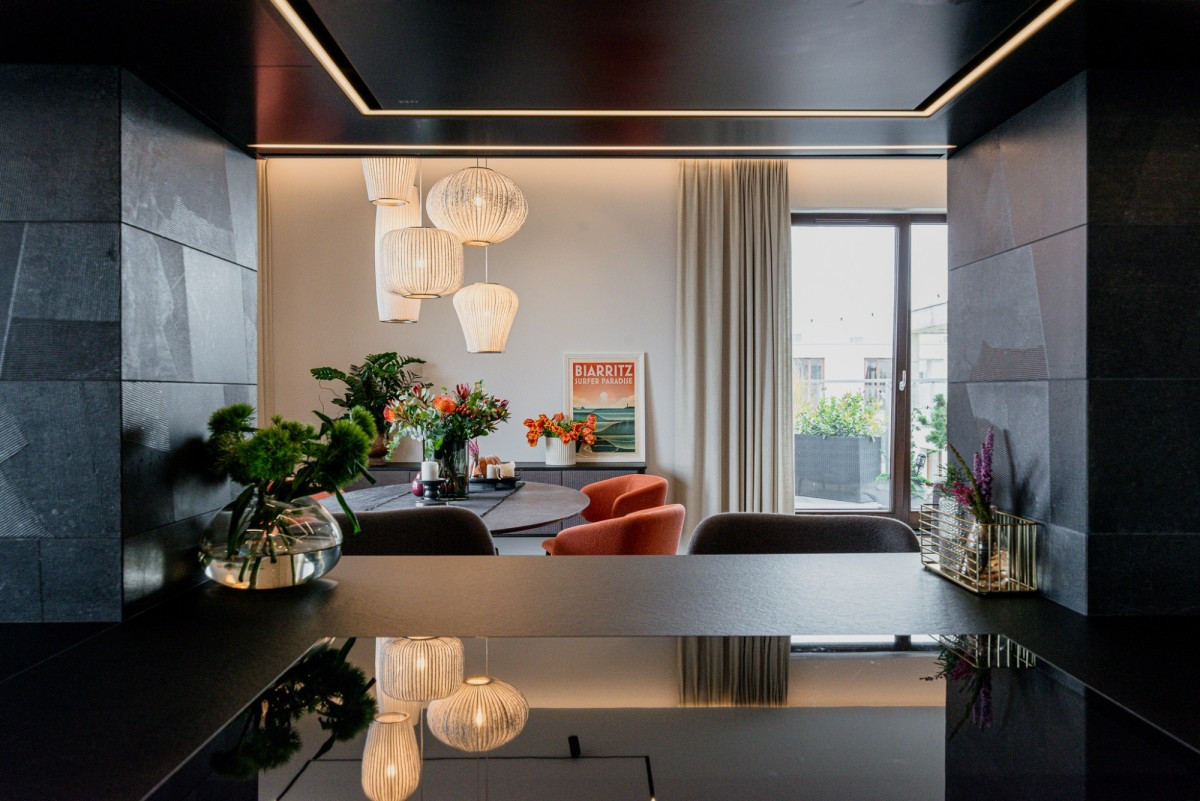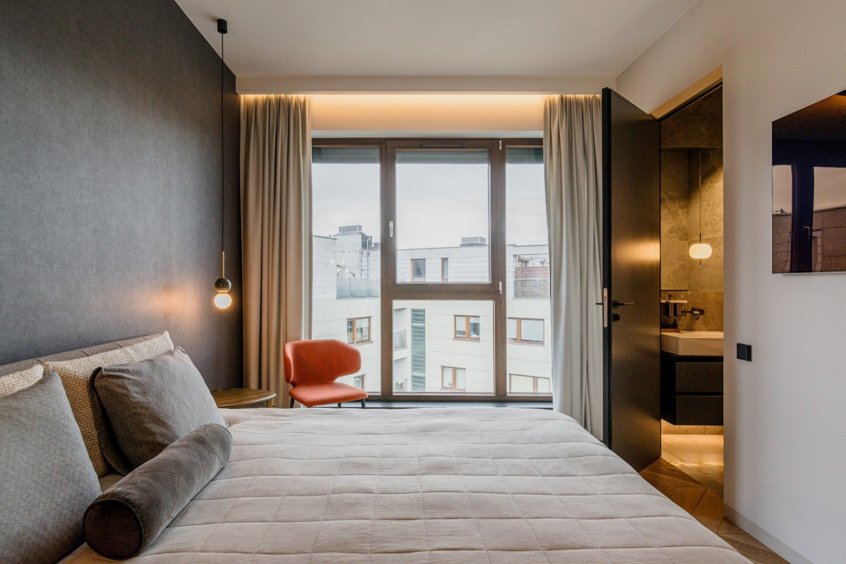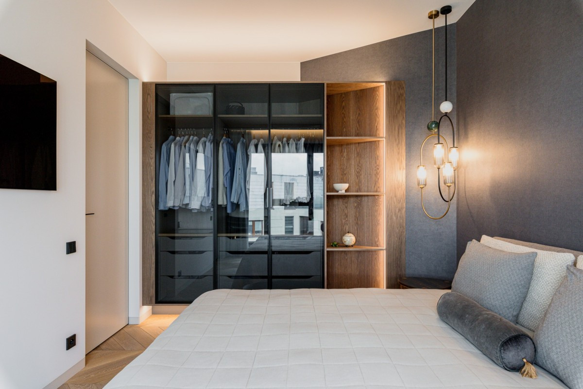The penthouse is located on the top floor of a modern apartment building on Oś Królewska, in the Błonia Wilanowskie neighborhood. It is an ideal place for those who value comfort, space, and privacy. Designed by an architect with attention to detail and ergonomics, the apartment offers ceilings up to 2.9 m high, enhancing the sense of spaciousness, while the smart home system ensures everyday convenience.