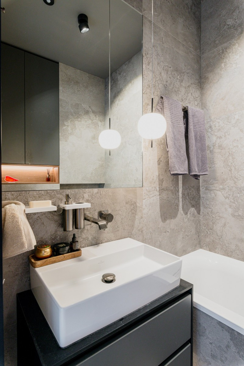 Duża łazienka z ukrytą pralnią.