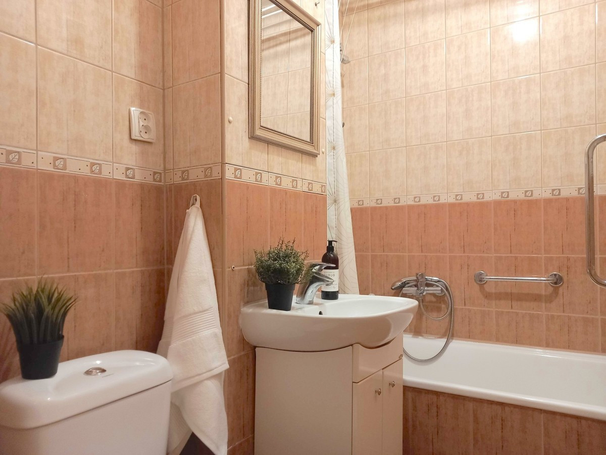 Jasny przestronny salon z dużymi oknami i ekspozycją na spokojną wschodnią stronę, wraz z balkonem, oddzielna wygodna kuchnia, oddzielna sypialnia, łazienka z wanną i WC a także przedpokój.
