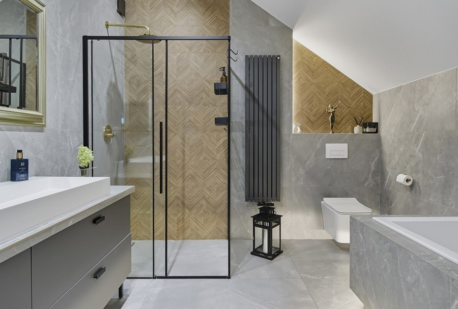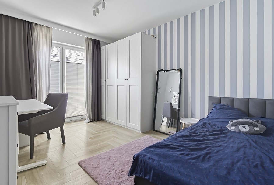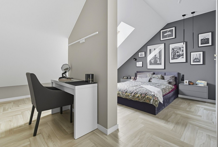 Na poddaszu: master bedroom z dużą łazienką i garderobą.