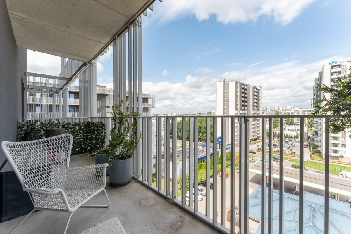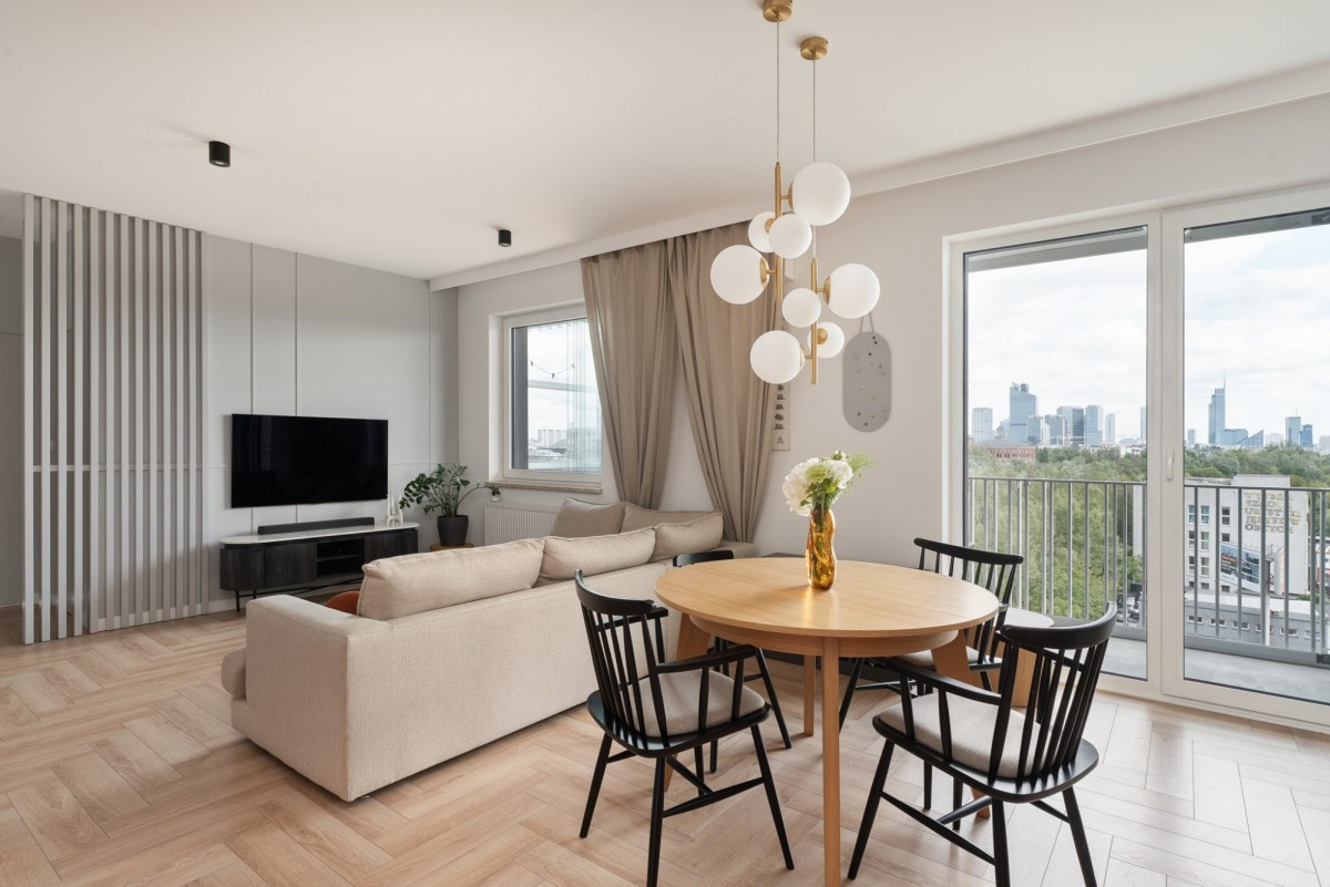 This elegant and thoughtfully designed 3-room apartment offers a total area of 86.13 m² and is located on the 7th floor of a modern, cascading-style building completed in 2022. The apartment stands out with its spacious living area (over 41 m²), two bathrooms, walk-in wardrobe, laundry/storage room, and two balconies - including a glazed orangery with an impressive view of the Warsaw skyline. Each room has air conditioning.