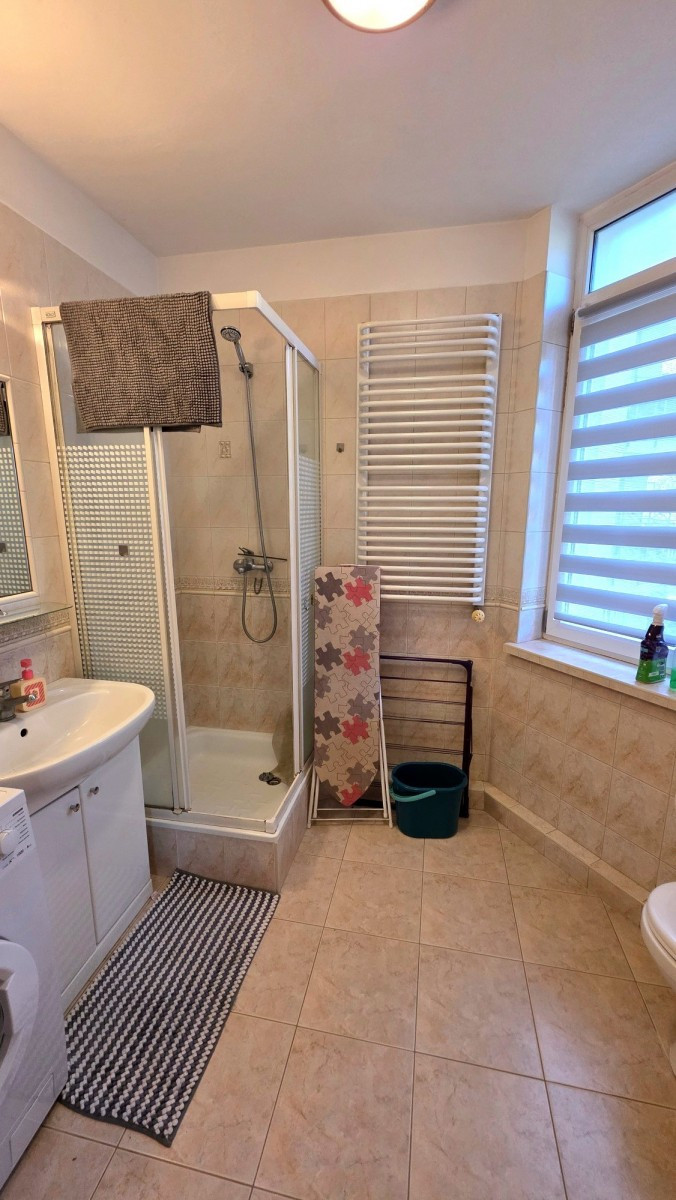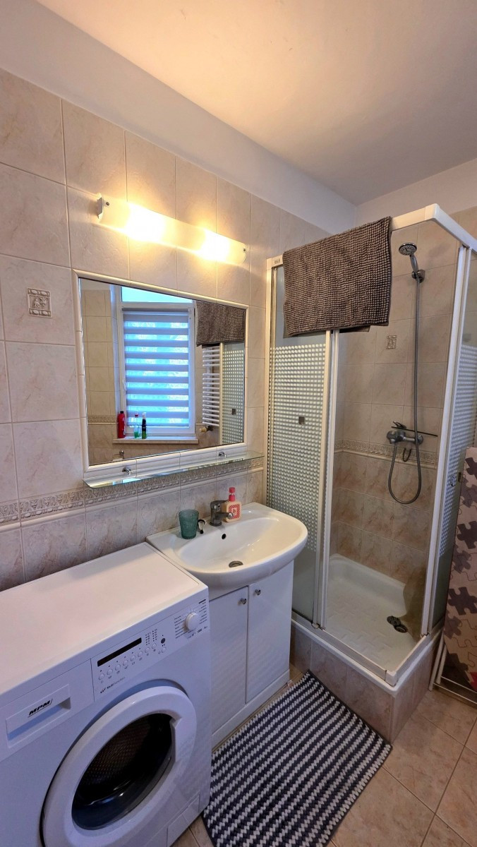- łazienki z oknem z widokiem na park, wyposażonej w kabinę prysznicową, umywalkę, pralkę, lustro