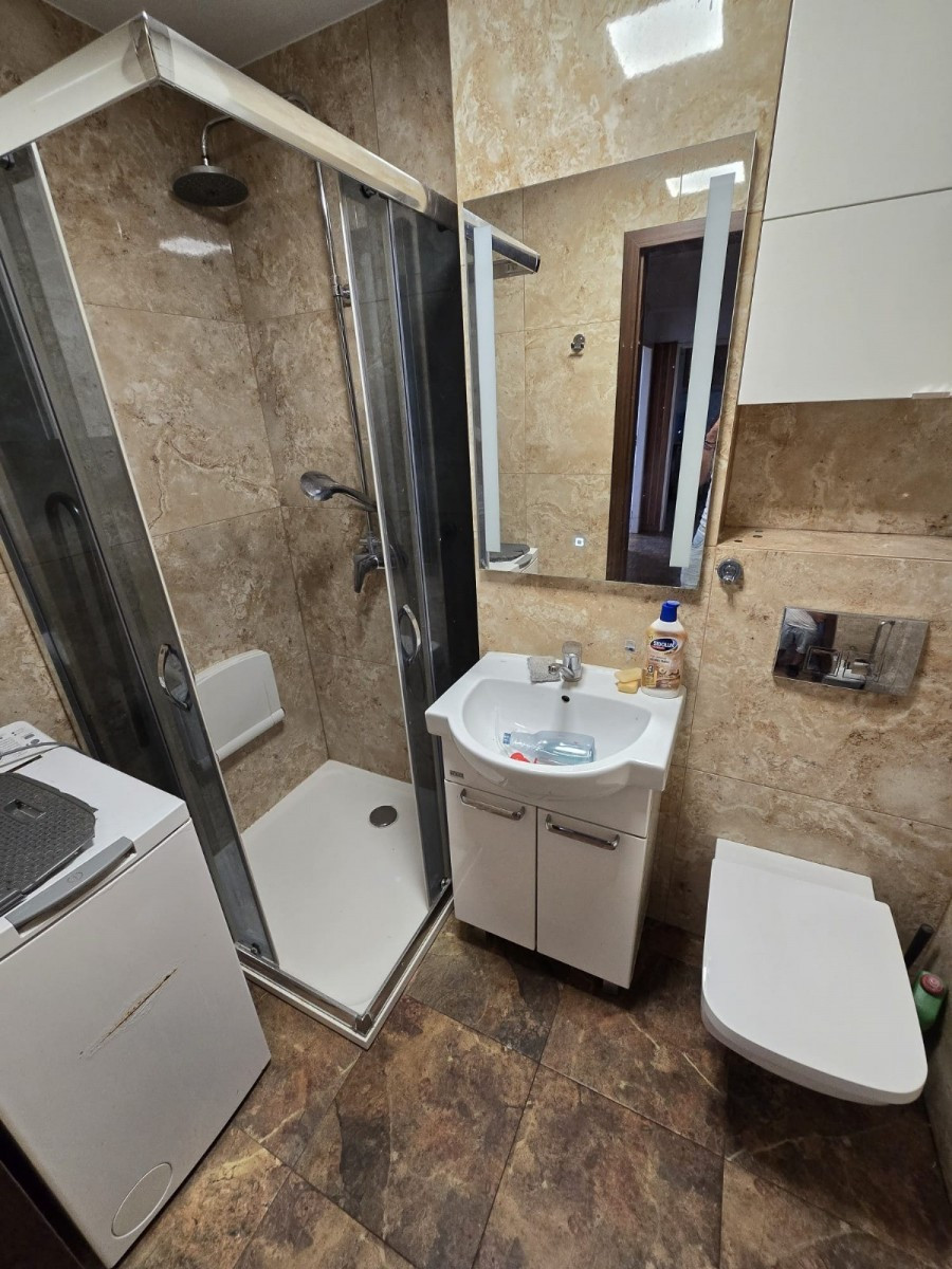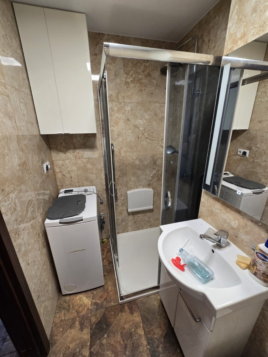 • łazienka z prysznicem i pralką, wymagająca odświeżenia,