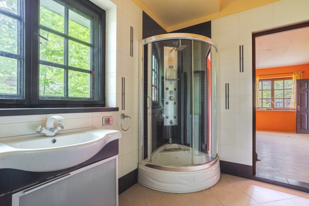 Na parterze mamy przestronny salon z jadalnią i kominkiem, kuchnię ze spiżarnią, pokój, łazienkę z wc, wiatrołap oraz basen.