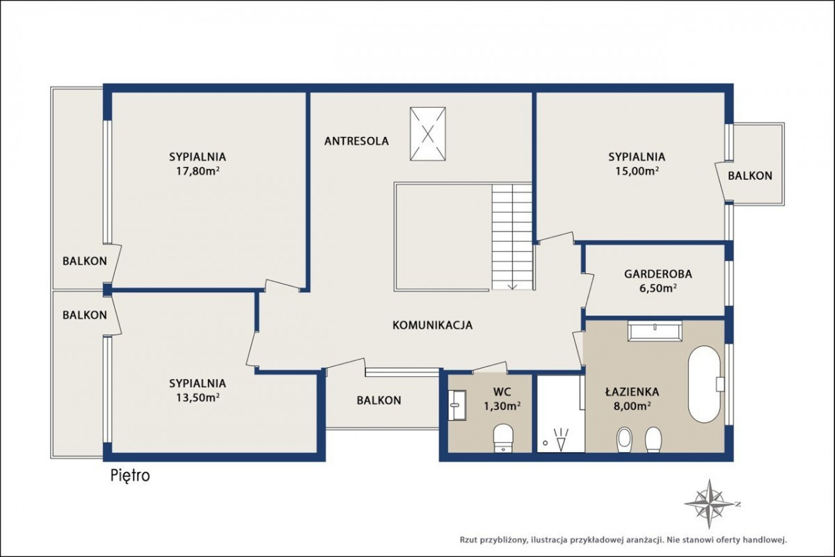 Na piętrze są trzy sypialnie, każda z balkonem, garderoba, łazienka, oddzielne wc oraz antresola.