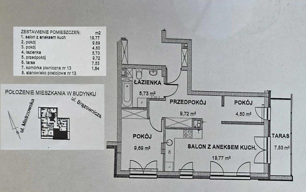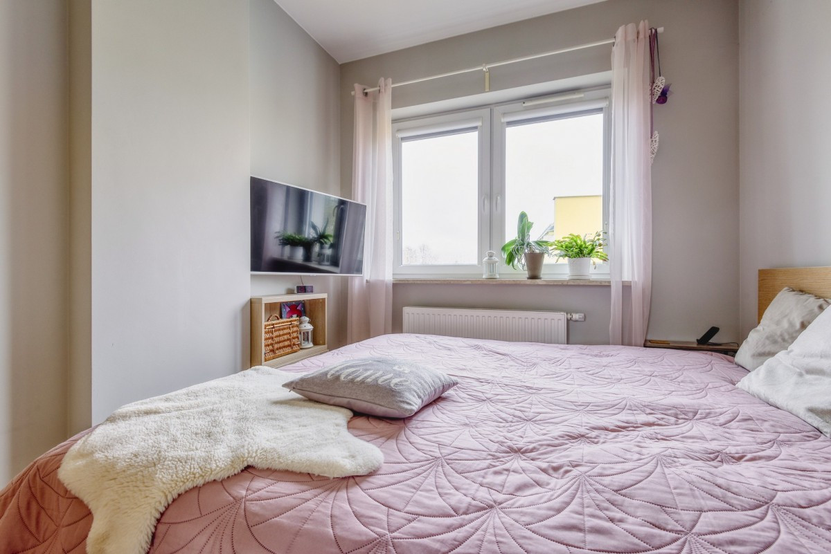 Sypialnia o powierzchni 9,53 m² ma kształt kwadratu, co czyni ją wyjątkowo ustawną i pozwala na swobodną aranżację wnętrza. Komfort dopełnia przestronny korytarz (9,72 m²), który umożliwia wygodne rozmieszczenie szaf i zapewnia poczucie przestrzeni. Łazienka o powierzchni 5,73 m² jest utrzymana w nowoczesnym stylu i nie wymaga żadnych nakładów finansowych.