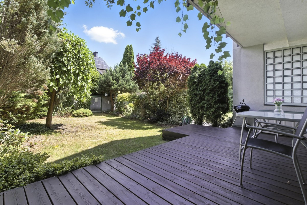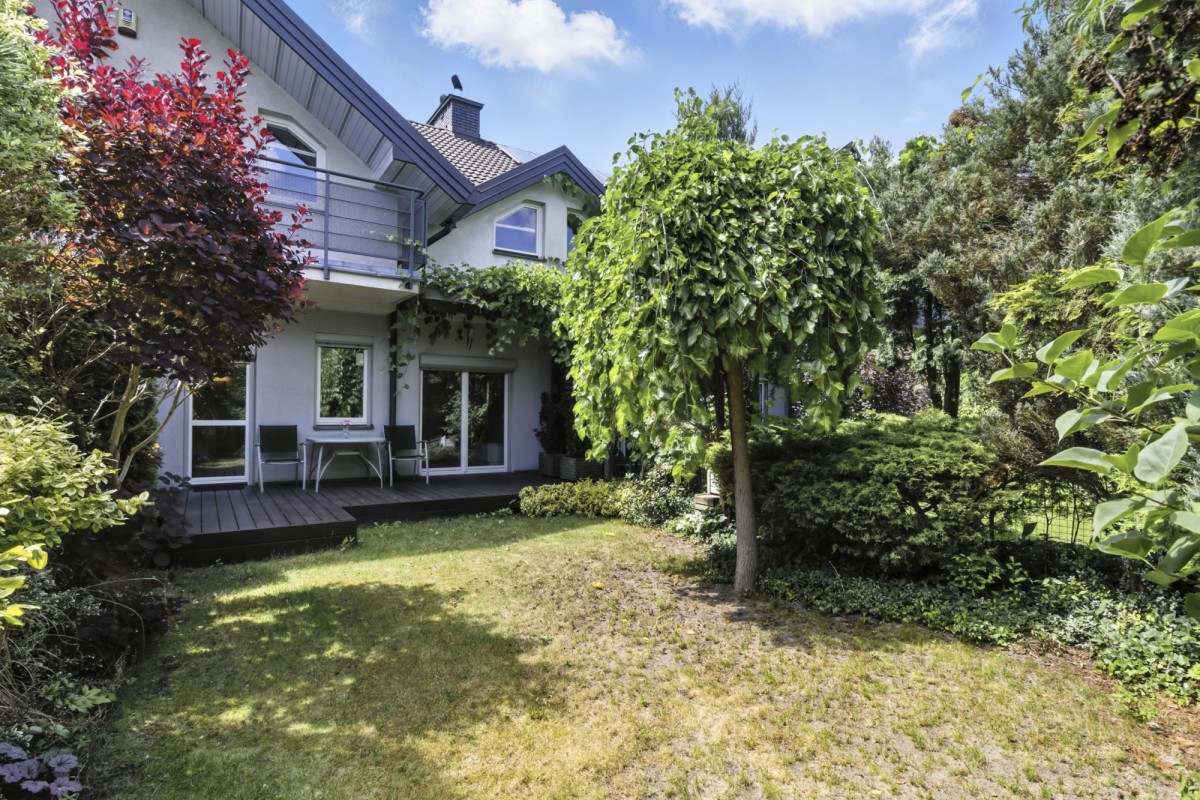 - ogród z zadaszonym tarasem i wysoką zielenią, która skutecznie osłania od sąsiadów i zapewnia prywatność,