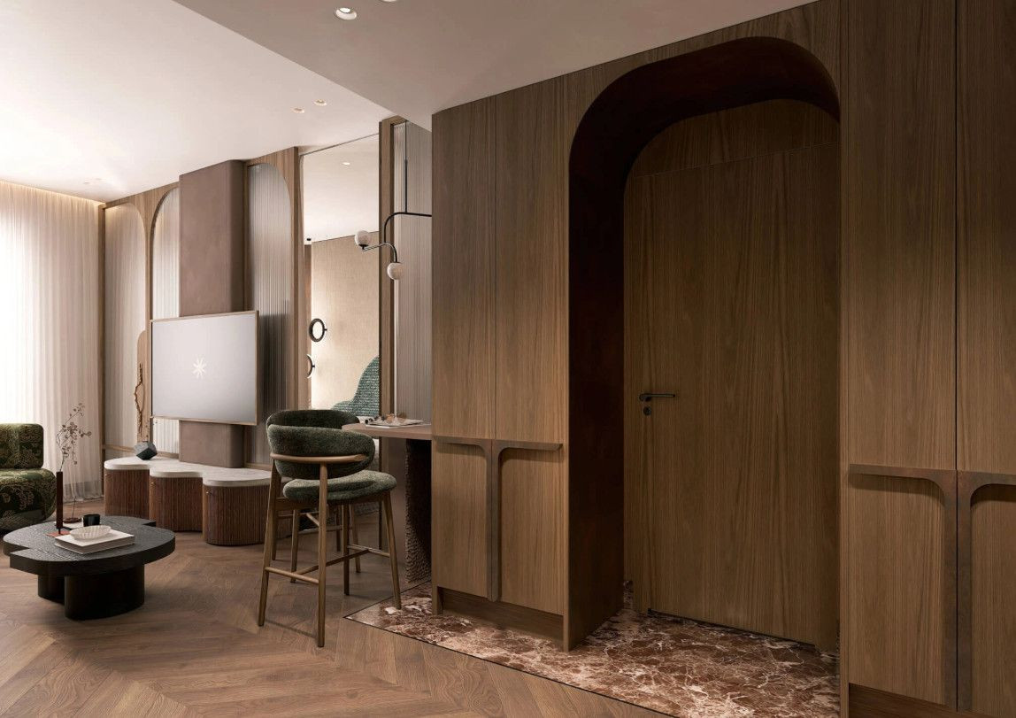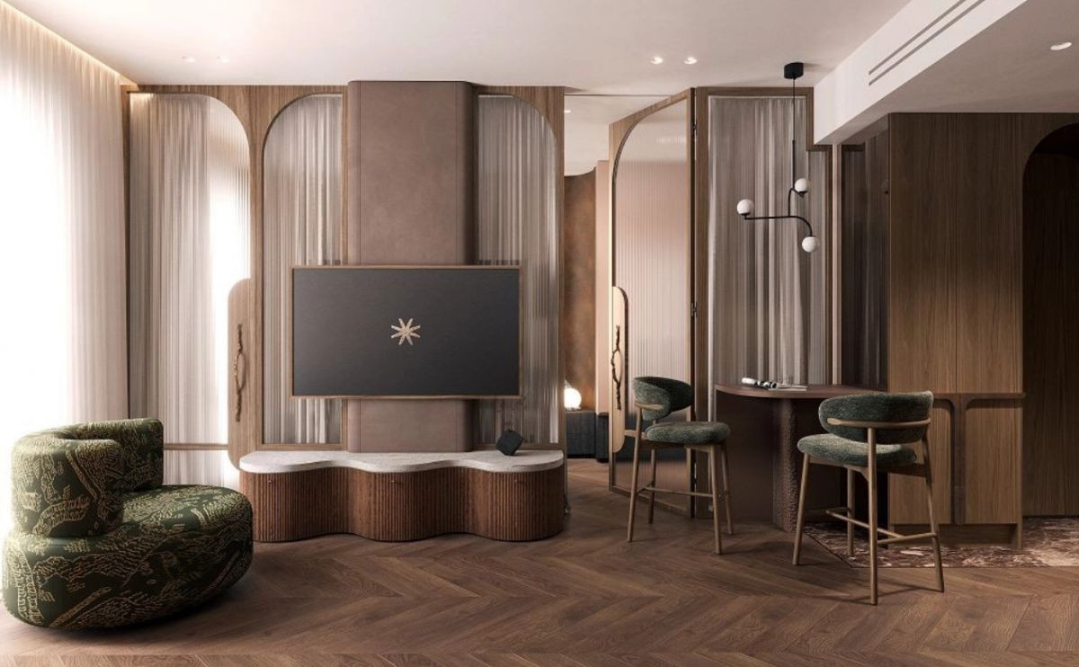 Wnętrza utrzymane są w eleganckiej stylistyce modernizmu i art déco - jasne tonacje drewna i kremowych tkanin kontrastują z ciemnym orzechem, antracytem i brązem, tworząc atmosferę wyrafinowanego luksusu.
