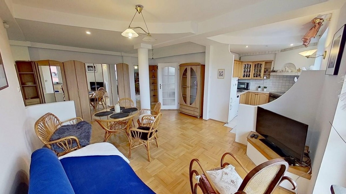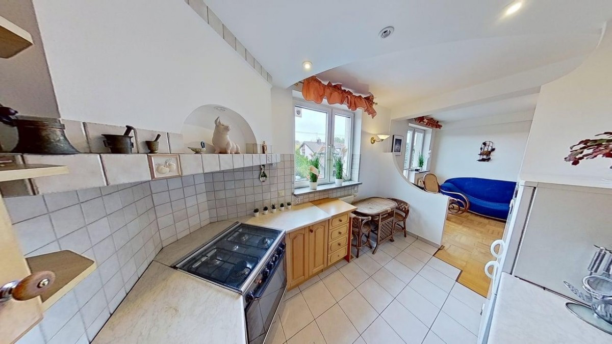 - salonu z półotwartą kuchnią z oknem, z wyjściem na balkon (strona zachodnia), wyposażenie kuchni: zmywarka, lodówka i kuchnia gazowa, piekarnik elektryczny
