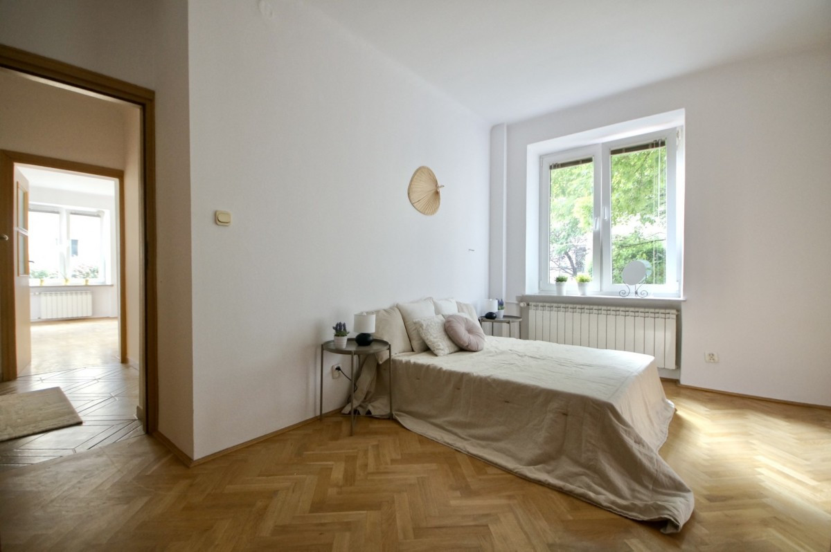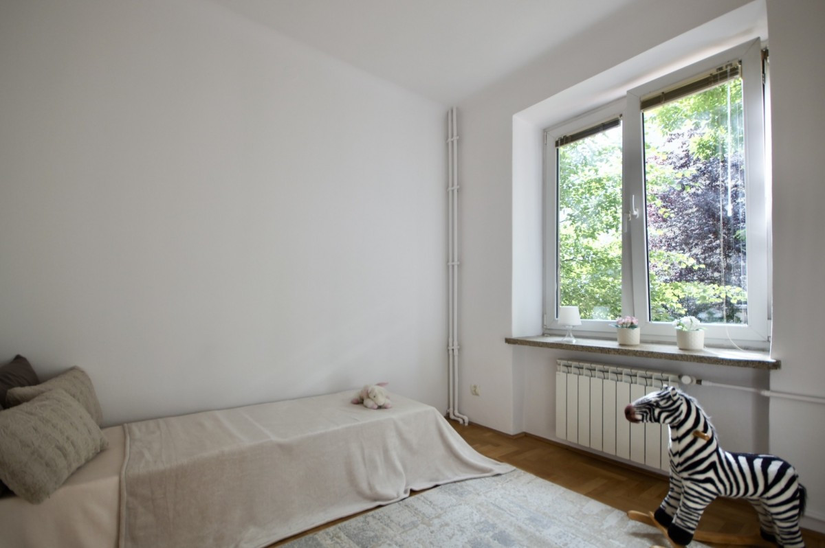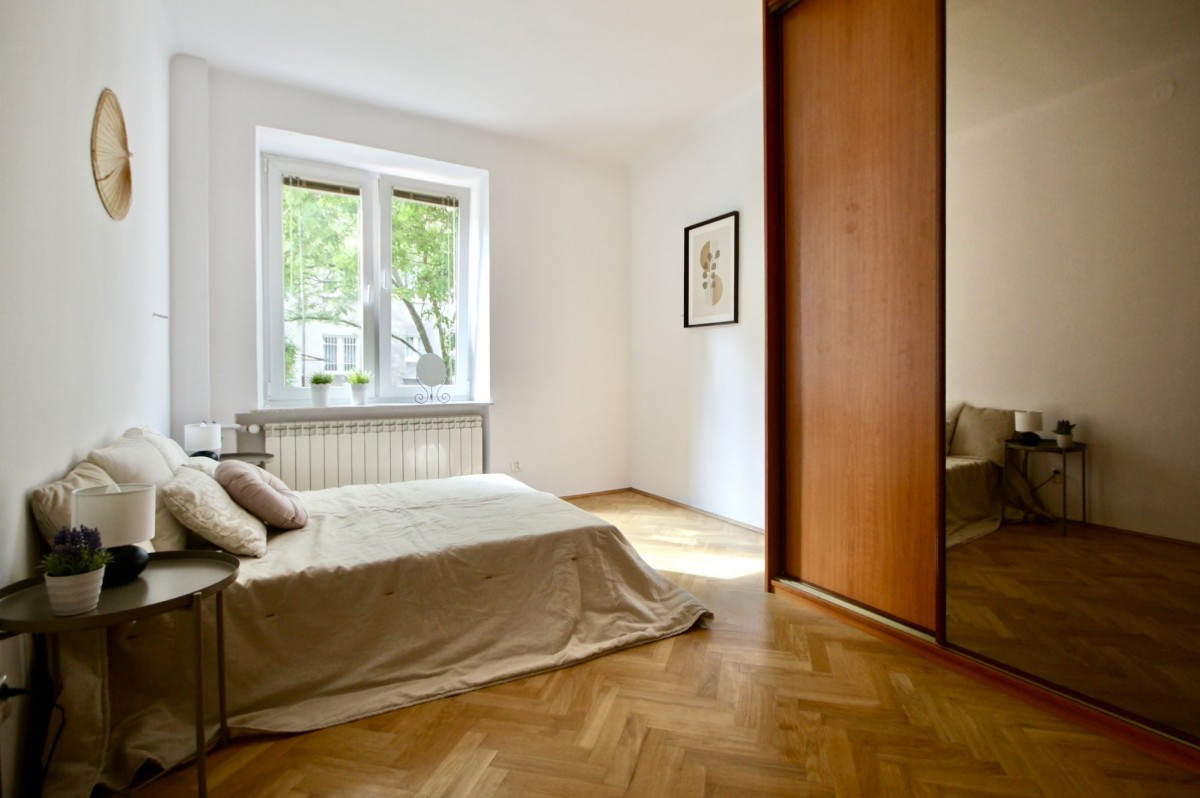 Na podłodze piękne drewniane parkiety. Okna na 3 strony: południe, zachód i północ. Kilka szaf w zabudowie. Wymienione, plastikowe okna z żaluzjami.