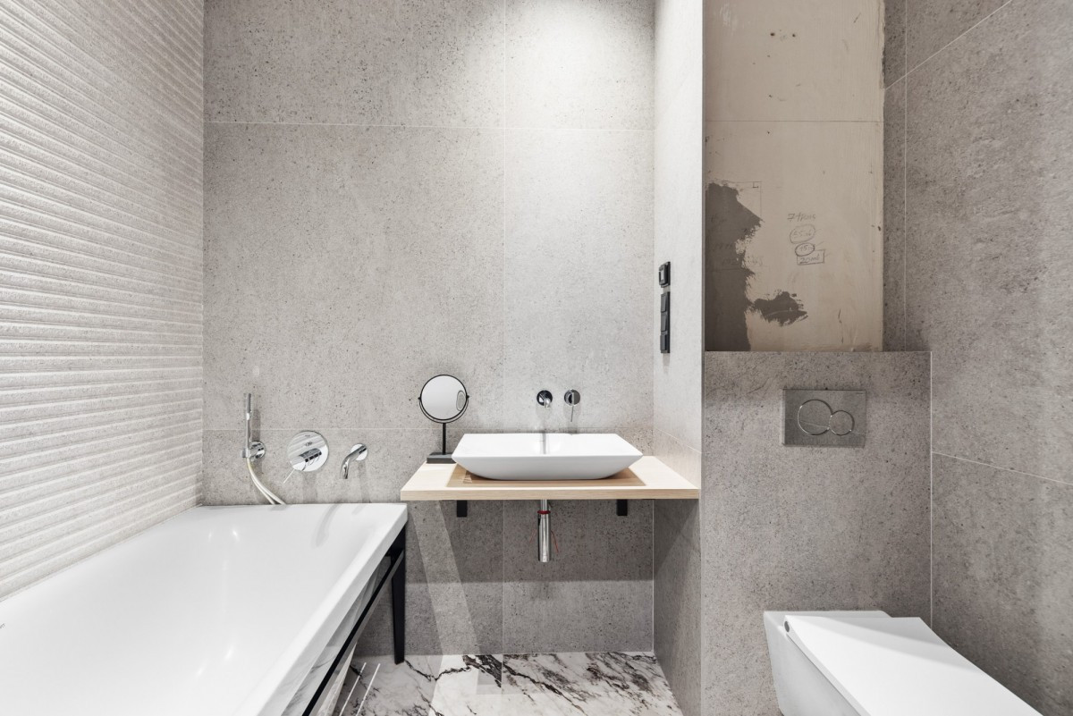 elegancka łazienka wyposażona jest w wannę - idealną do relaksu po dniu pracy. Użyto tu wysokiej jakości ceramiki i armatury od wiodących producentów.