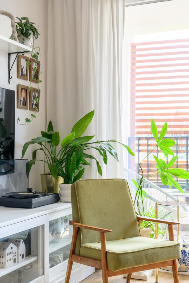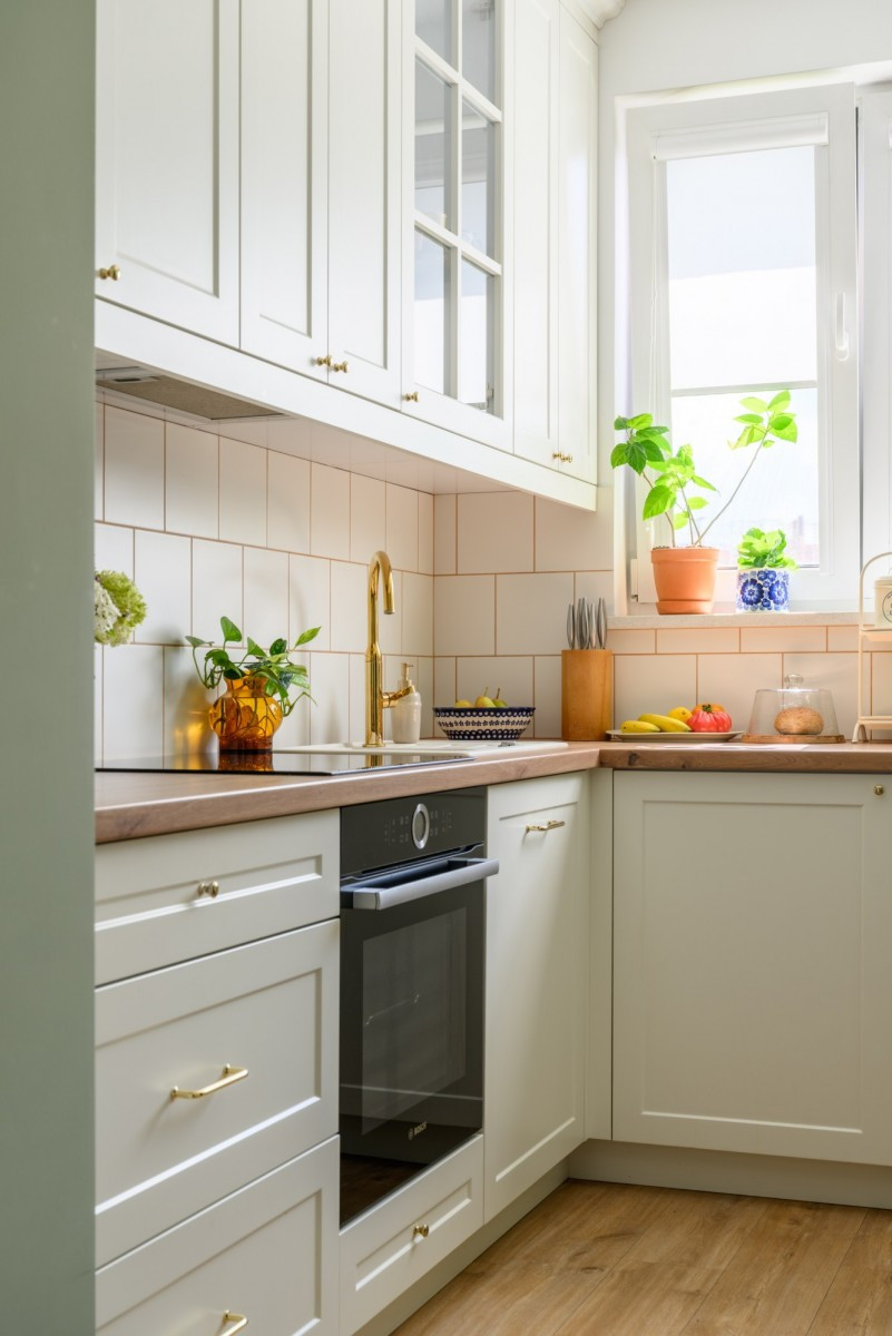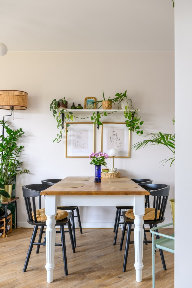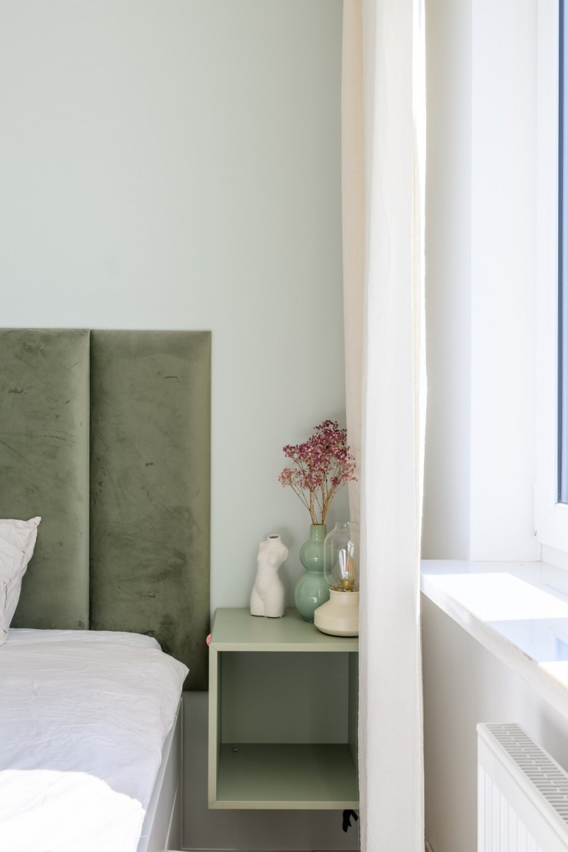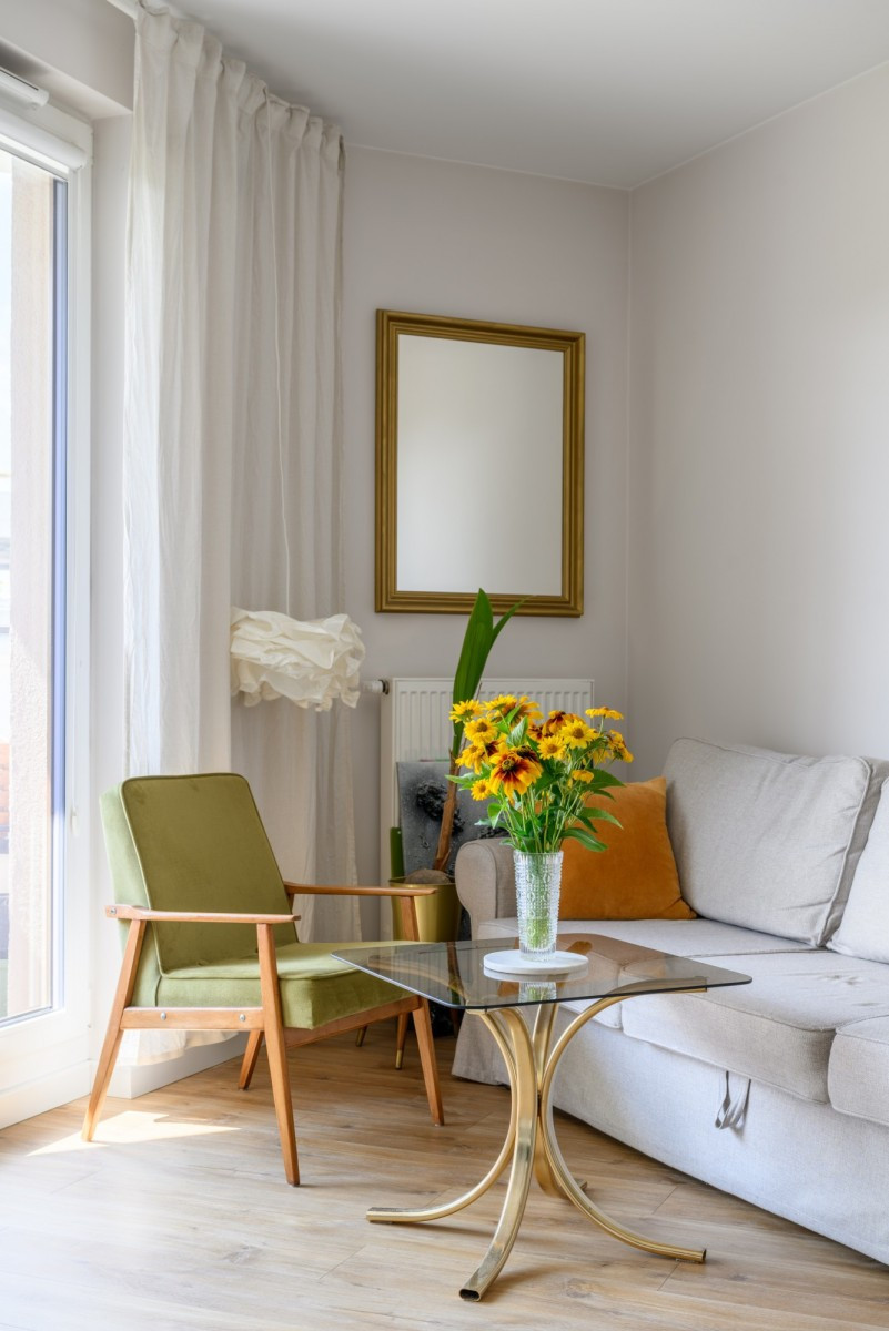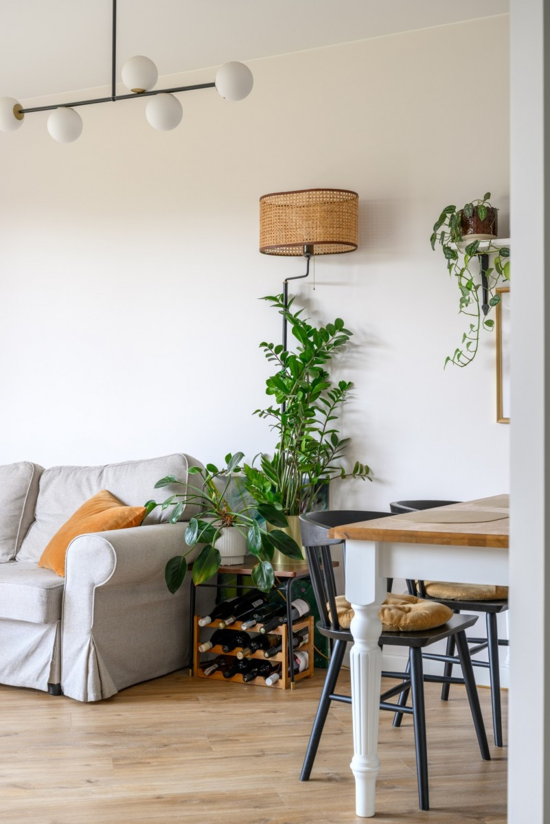 Wnętrze urządzone w stylu skandynawskim. Duże okna i ekspozycja południowo-wschodnia zapewniają doskonałe doświetlenie wnętrz naturalnym światłem przez większą część dnia - zwłaszcza rano i wczesnym popołudniem. To idealne rozwiązanie dla osób, które lubią budzić się przy porannym słońcu i cenią sobie przytulną atmosferę wnętrza przez cały dzień.