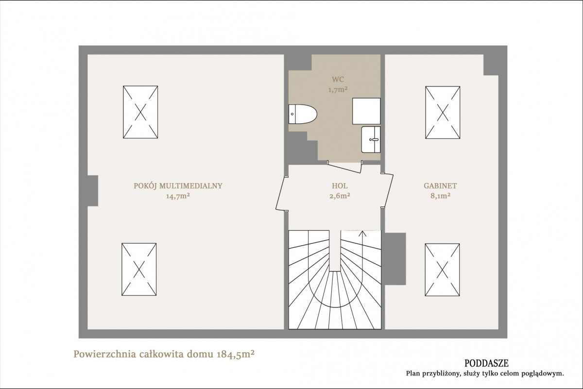 Na poddaszu jest pokój, który może pełnić funkcję gabinetu, łazienka oraz bardzo duży pokój multimedialny.