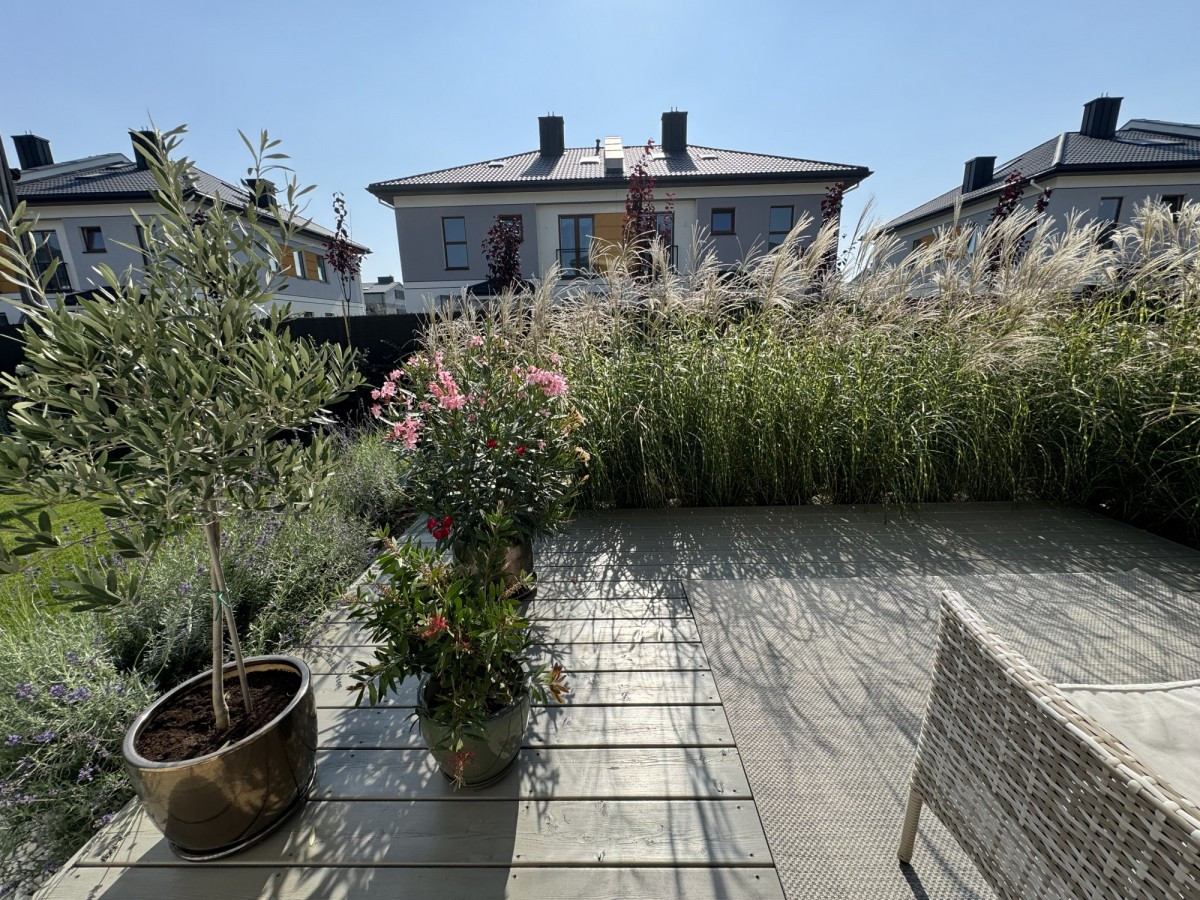 Salon wyposażony jest w kominek, klimatyzację, ogrzewanie podłogowe. Z salonu znajduje się wyjście na taras i pięknie zagospodarowany ogród (liczne nasadzenia