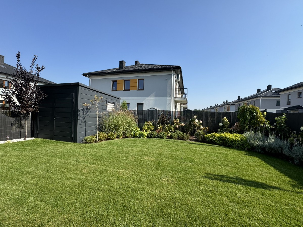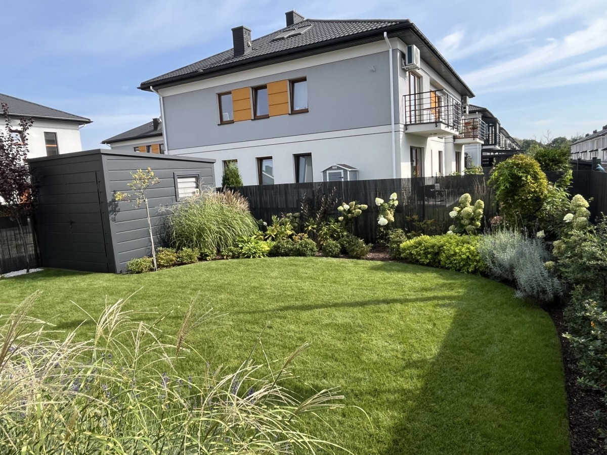 Duży 120 m2 ogród z domkiem na narzędzia i sprzęt ogrodniczy.