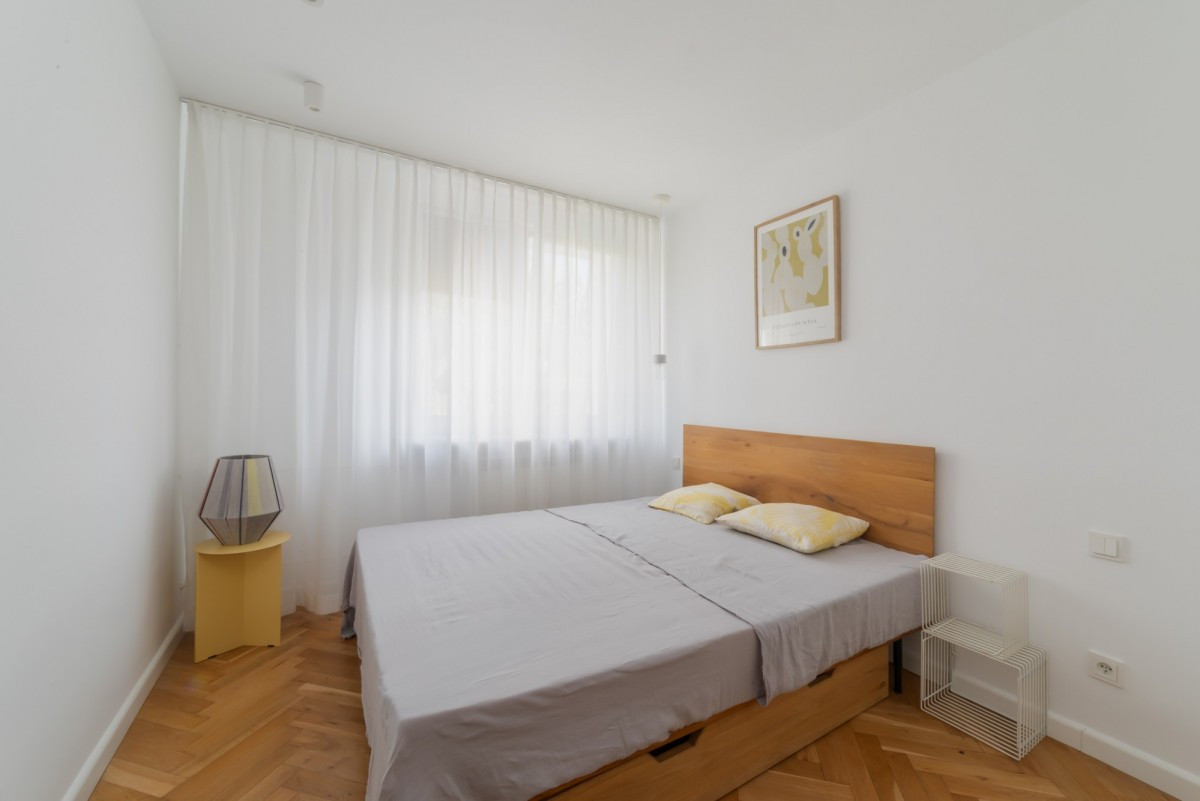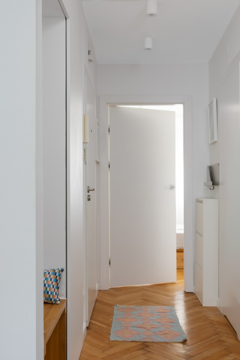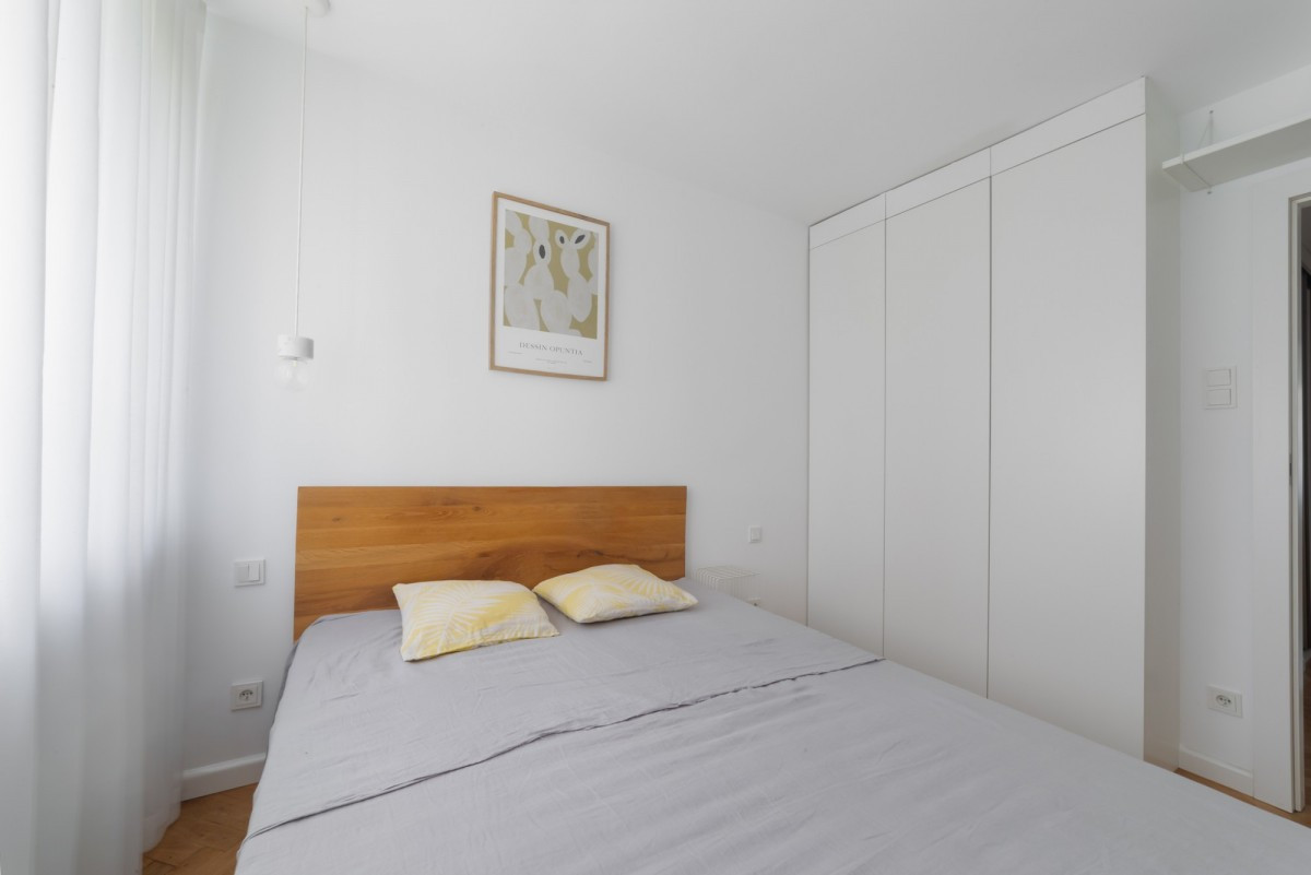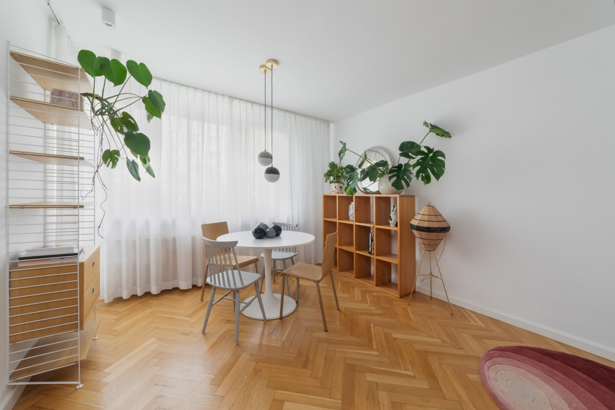 Wnętrze zostało urządzone ze smakiem i wyczuciem stylu. Dominują w nim jasne, naturalne barwy, które optycznie powiększają przestrzeń i tworzą harmonijną całość. Ciepłe drewno zestawione z beżami i bielą nadaje mieszkaniu przyjemny i elegancki charakter. Dzięki stonowanej kolorystyce aranżacja jest ponadczasowa i uniwersalna, a jednocześnie przyjazna i pełna domowego ciepła.