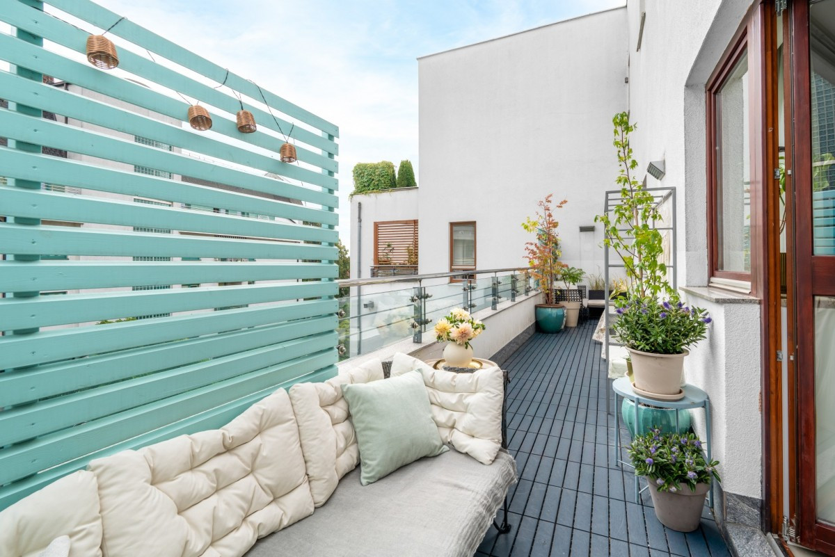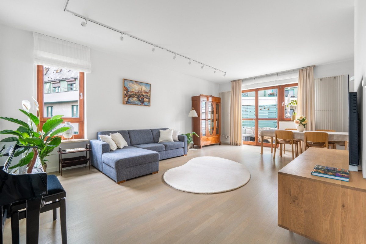 • Przestronny salon o powierzchni 30 mkw połączony z dużą kuchnią i wyjściem na 17 metrowy balkon.