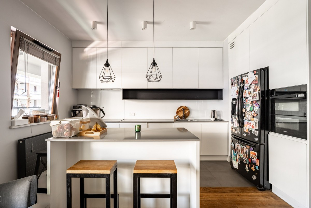 Kuchnia została wyposażona w sprzęt AGD renomowanych marek. Liczne pojemne szafki i funkcjonalne rozwiązania przechowywania łączą elegancję z praktycznością. Apartament położony jest w wyjątkowo spokojnej lokalizacji - okna wychodzą zarówno na zielone patio, jak i na drogę przeciwpożarową, po której nie poruszają się samochody, co zapewnia ciszę i komfort.